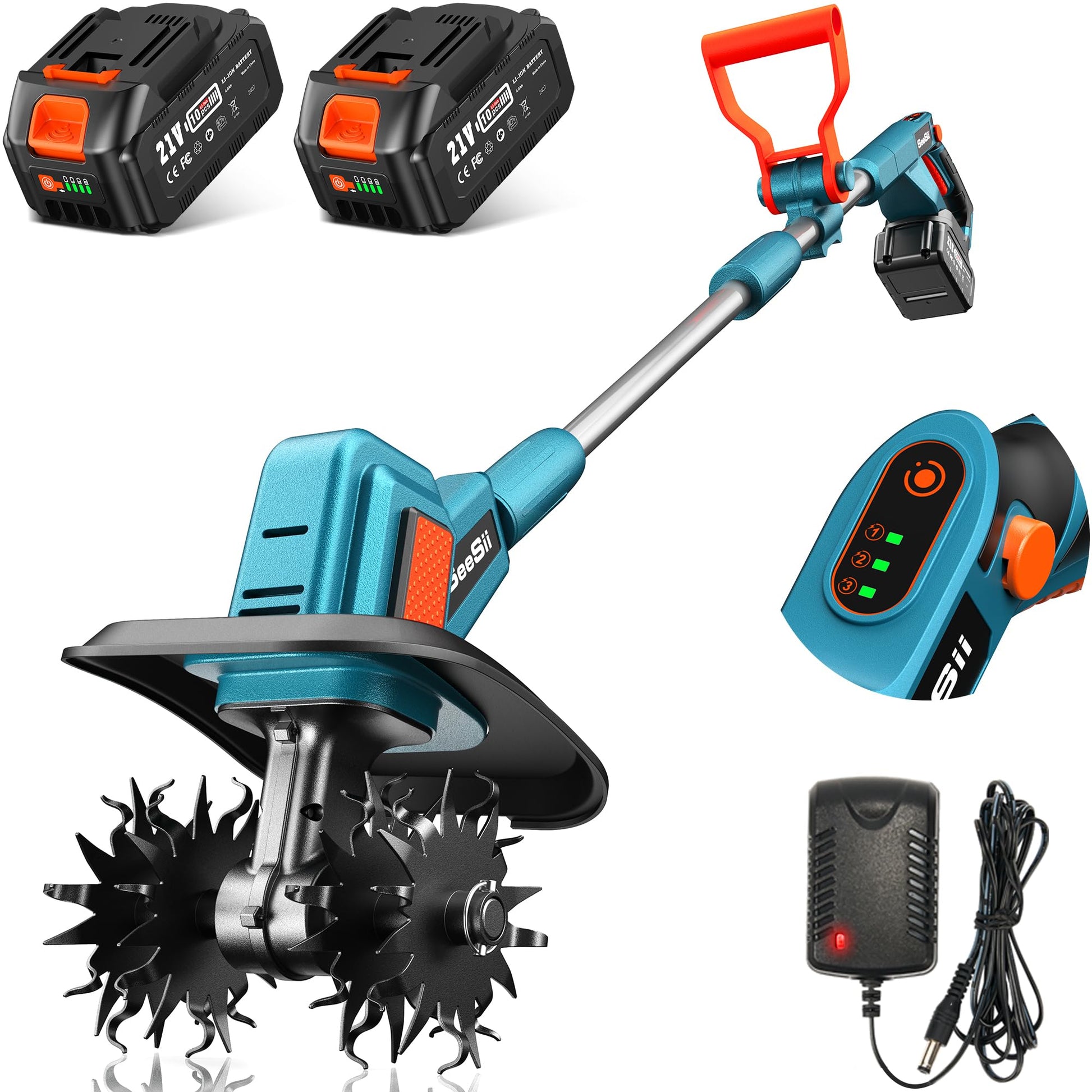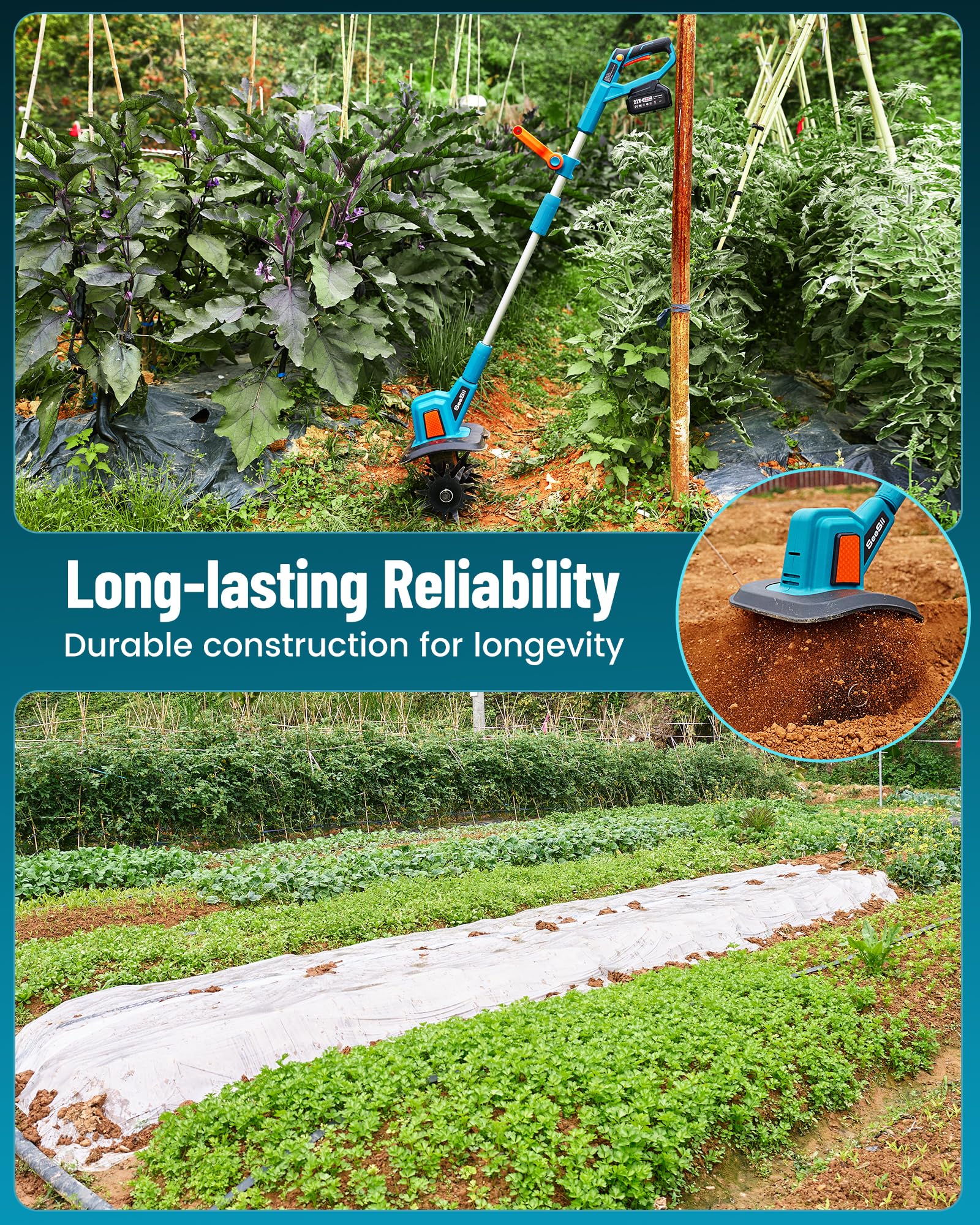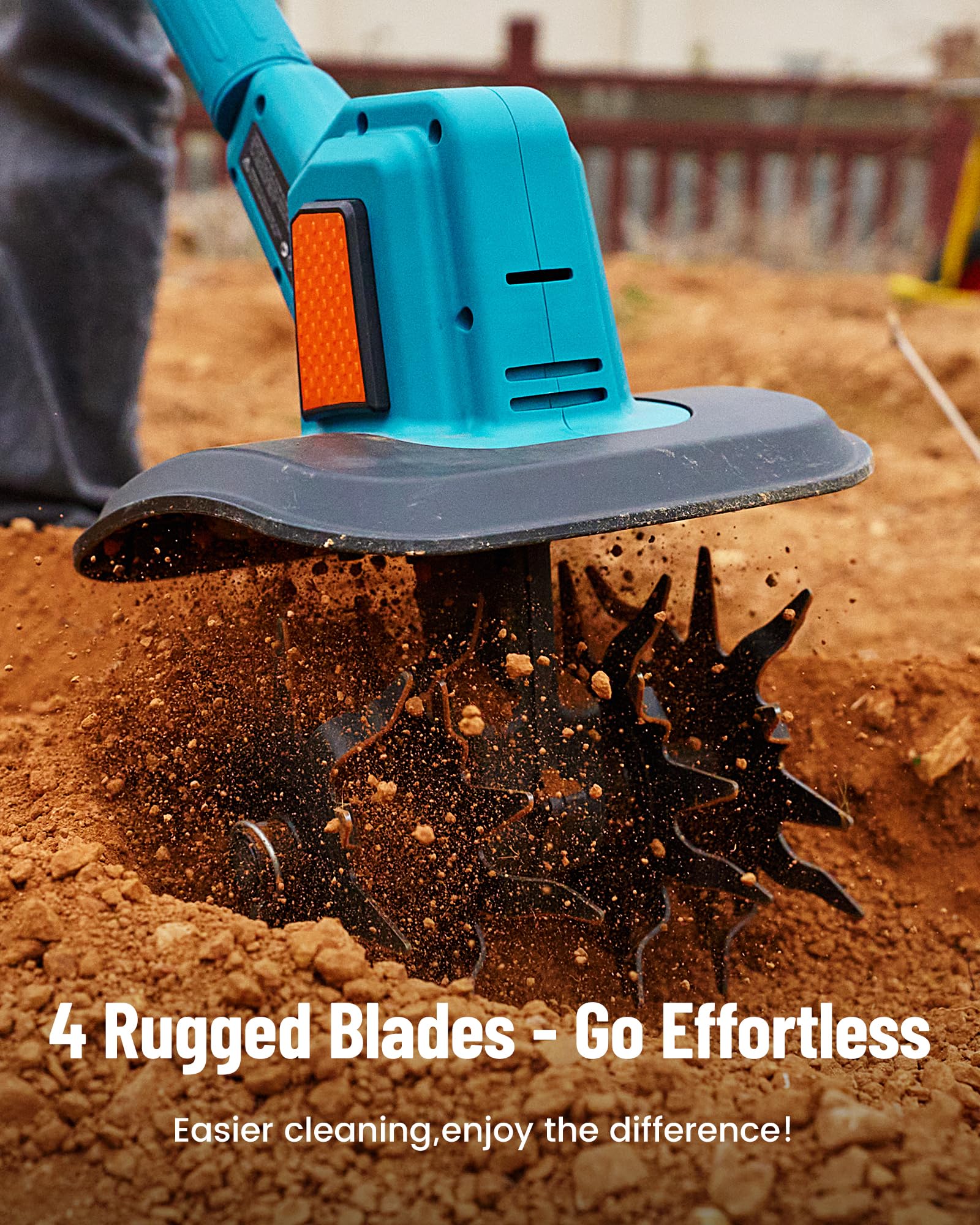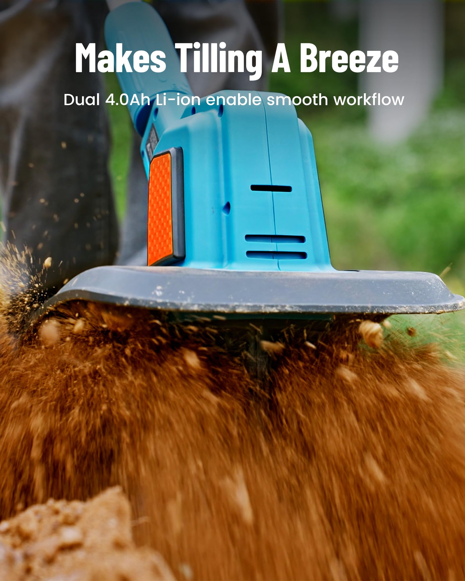 Battery Powered Garden Tiller: Dual Battery Advantage - The inclusion of two 4.0Ah batteries doubles your tilling runtime, providing extended operation on a single charge. Whether you're cultivating hard, compacted soil or working through softer terrain, you'll experience seamless power delivery from start to finish