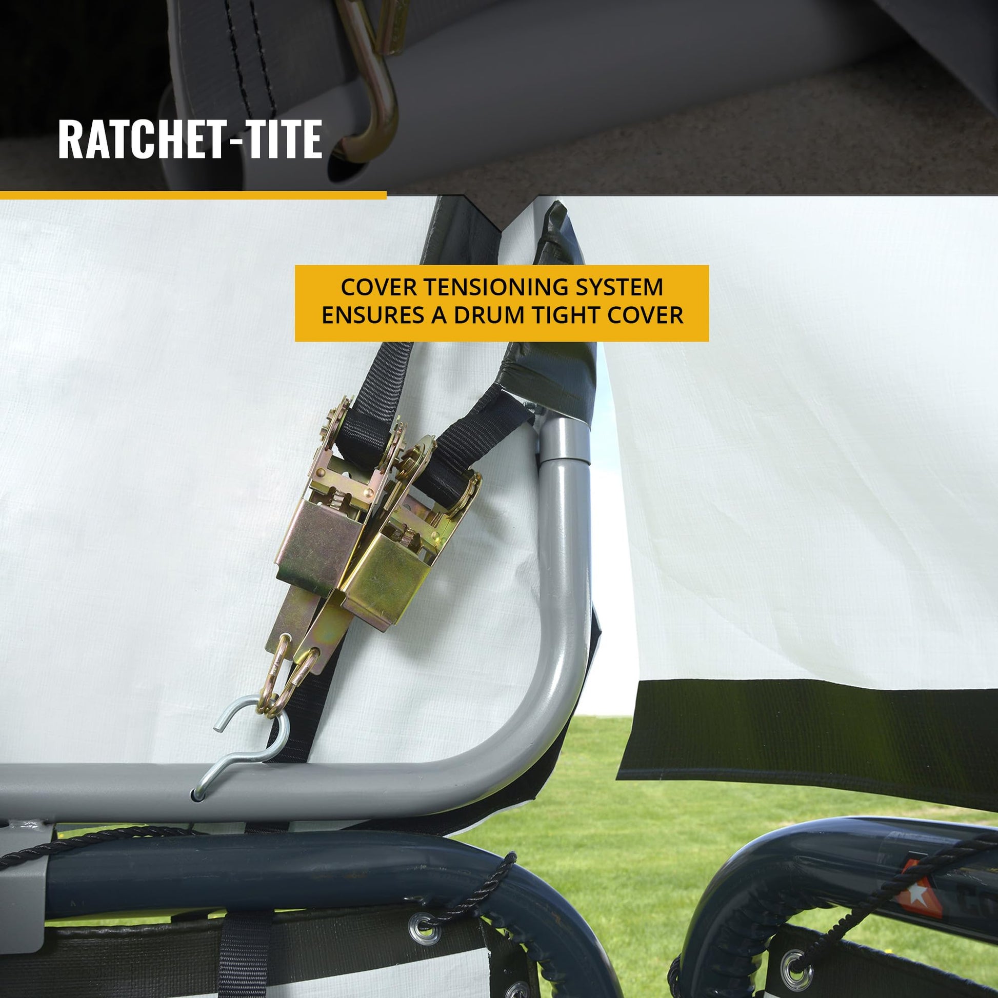 STRONG AND STURDY: Ratchet-tite tensioning on end panel for a drum-tight cover ensures maximum protection for all your agricultural items, livestock, and horses