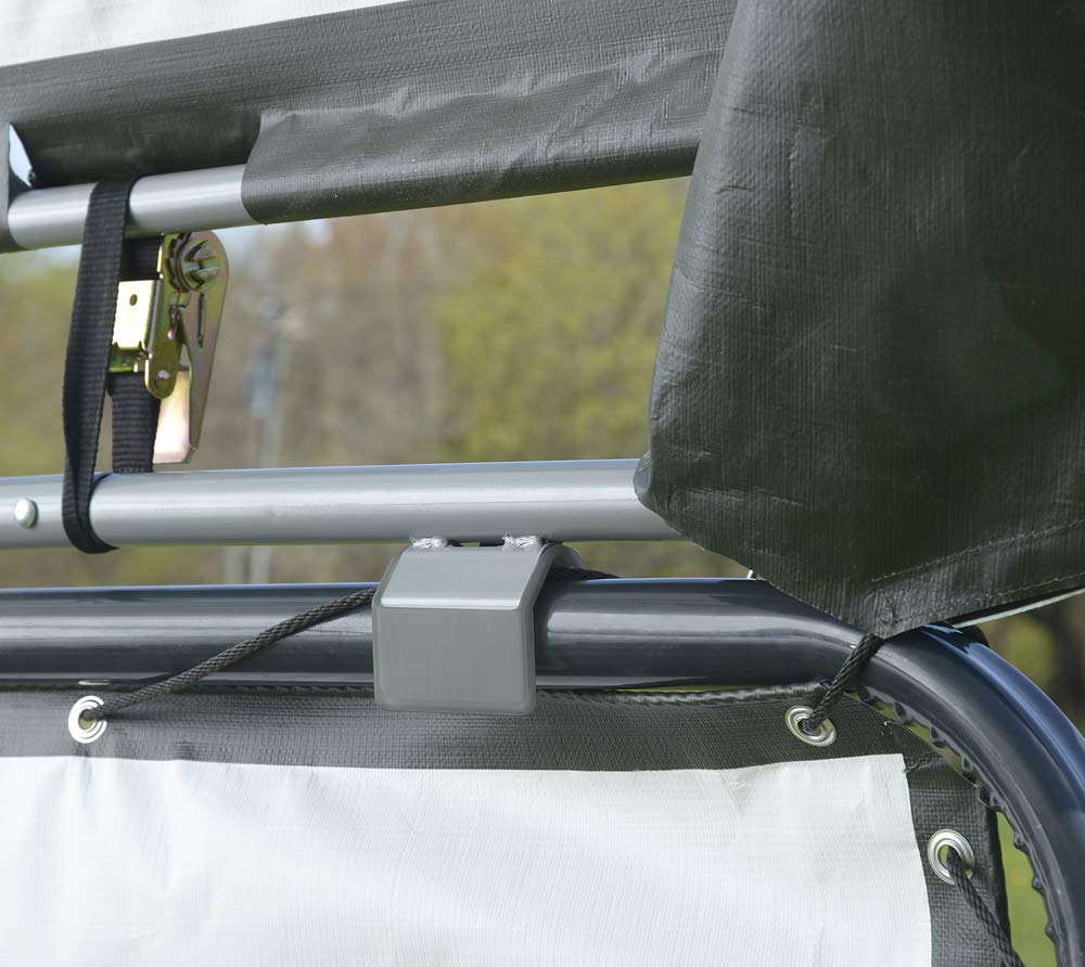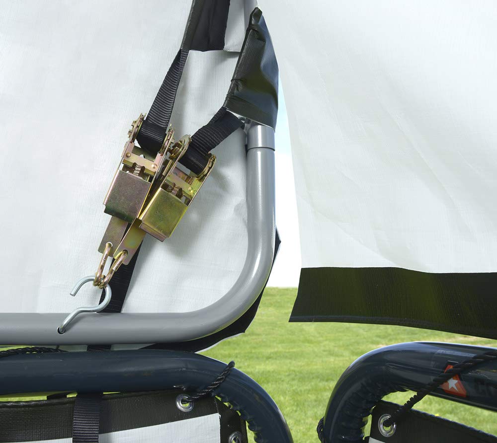 STRONG AND STURDY: Ratchet-tite tensioning on end panel for a drum-tight cover ensures maximum protection for all your agricultural items, livestock, and horses; measures 144" D x 144" W x 126" H