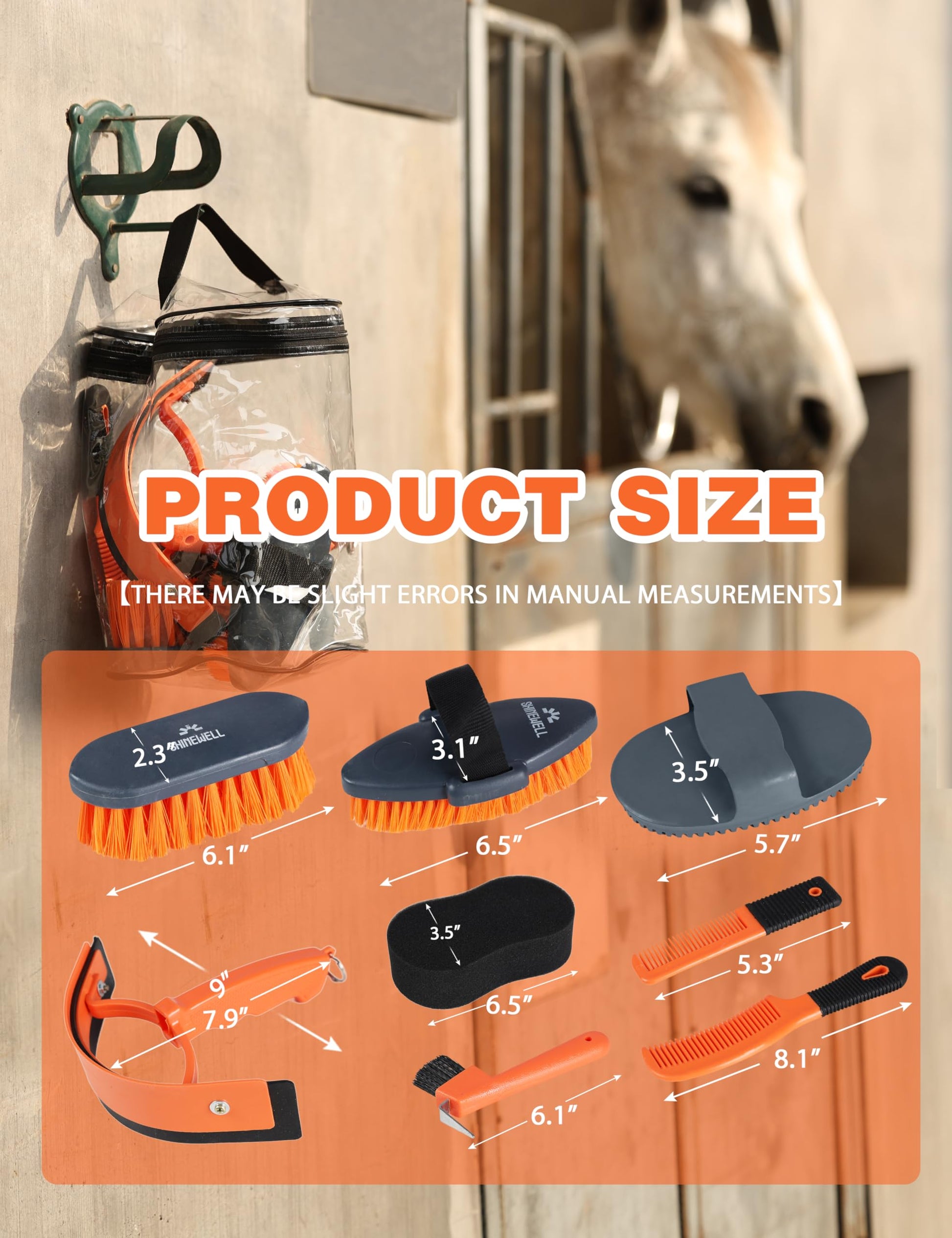 Complete 9-Piece Kit: Includes all essential grooming tools: dandy brush, soft brush, massaging brush, sweat scraper, hoof pick, mane comb, tail comb, and a compressed sponge—plus a rubber band pack for mane and tail styling.