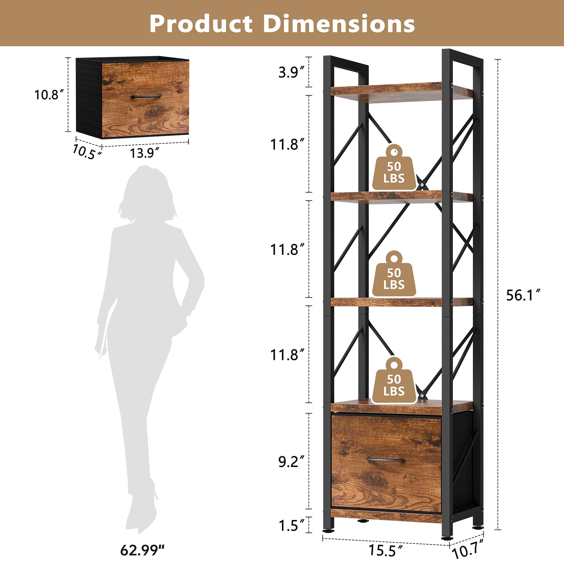 Shintenchi Bookshelf, 5 Tier Bookcase with Drawer,Home Office Bookcase Shelf Storage Organizer,Metal and Wood Industrial Bookshelves for Bedroom, Living Room and Home Office,Rustic Brown