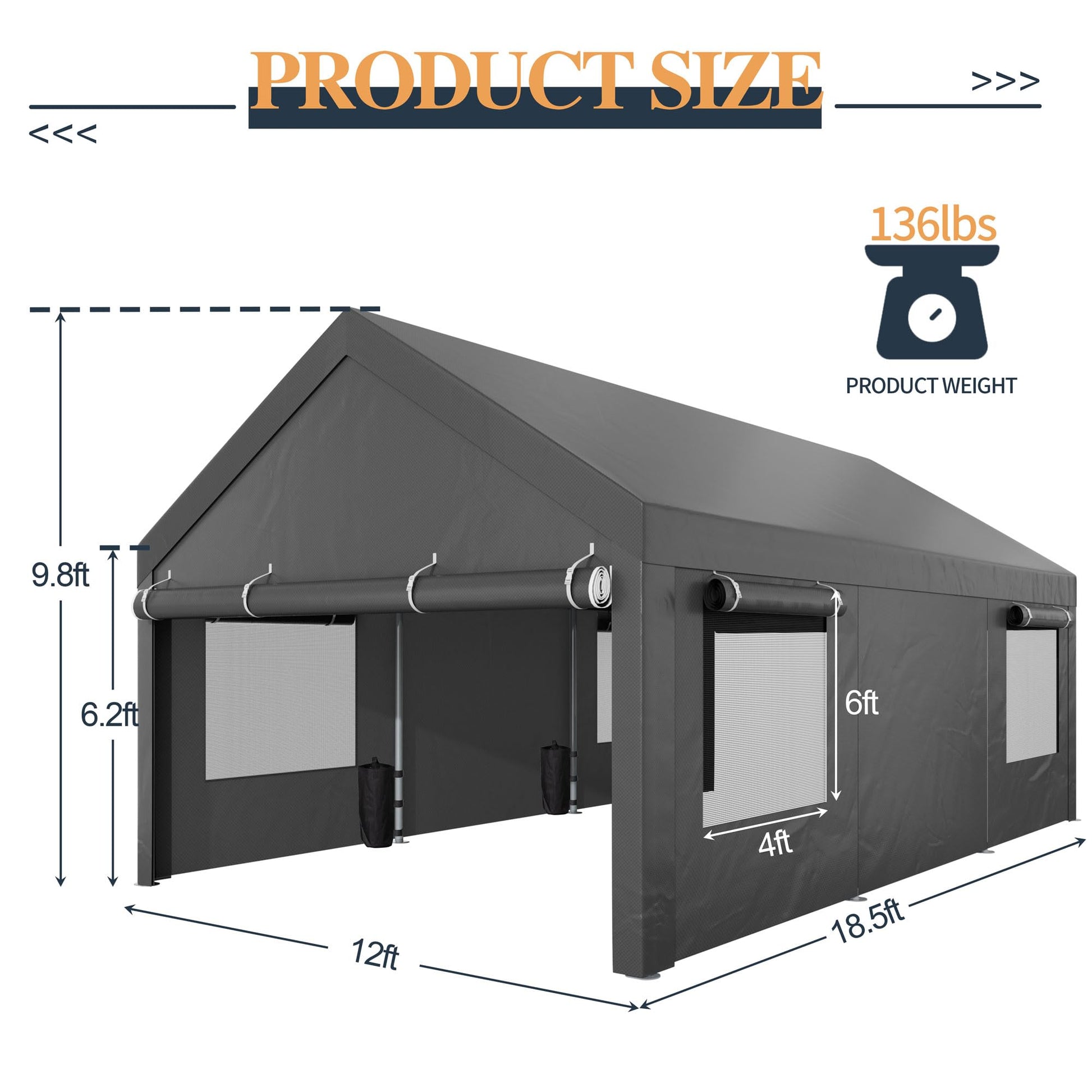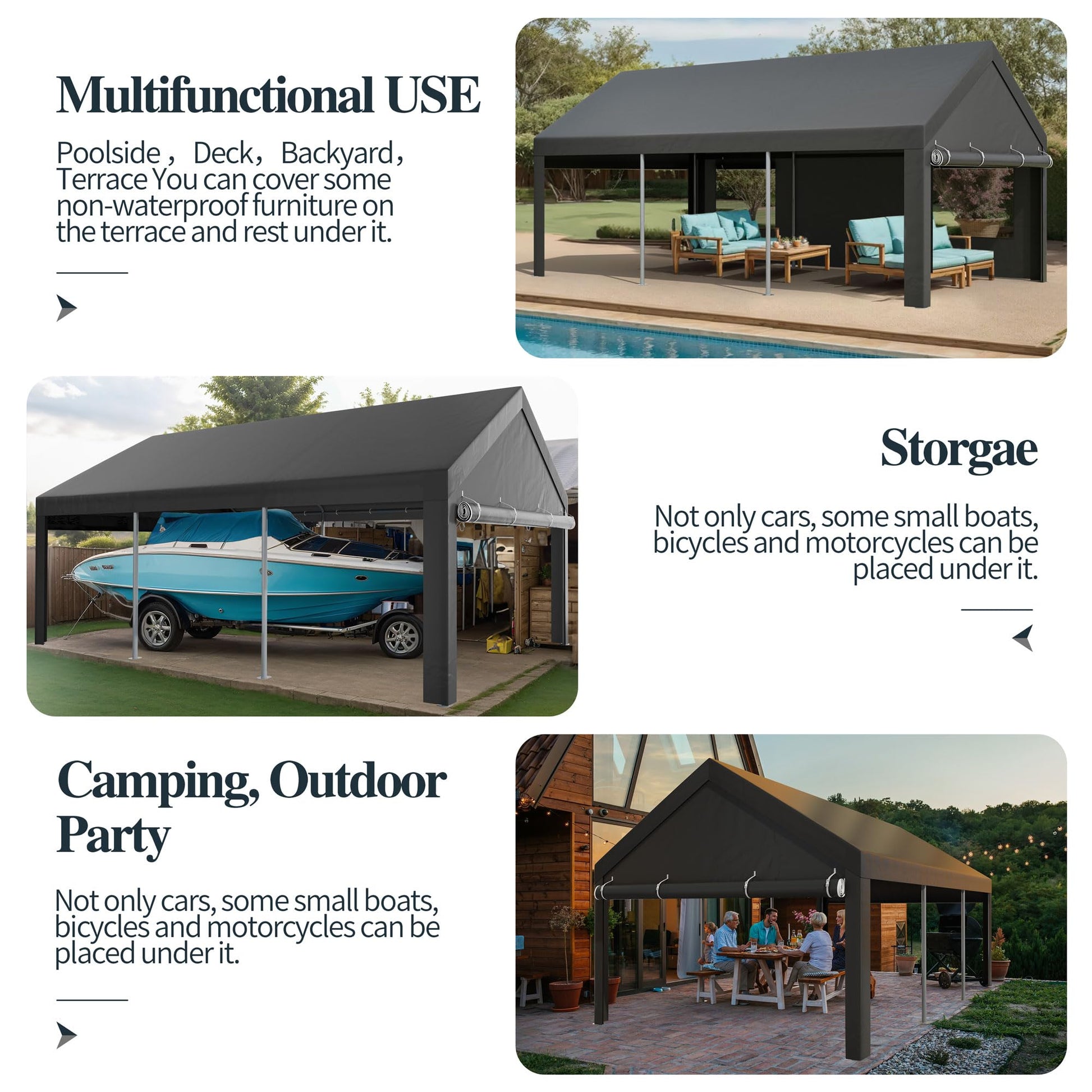 【Removable Side Walls & Ventilation Windows】: The roof of our carport is designed with 4 ventilation Windows on the side walls for optimal airflow throughout the year. The outer curtain can be rolled up or lowered according to the season and climate. At the same time, the four walls of the carport can be removed according to demand, which better creates space for the needs other than parking.