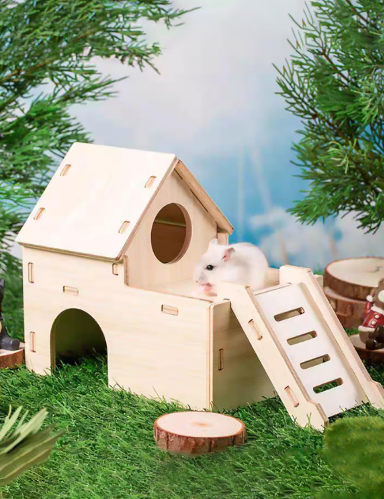 Sirvarni Hamster Hideout Cage Accessories - Hamster House and Habitat Wooden Hide Hut with Climbing Ladder and Platform for Dwarf Gerbils and Mouse Mice Rat Other Small Animals etc.
