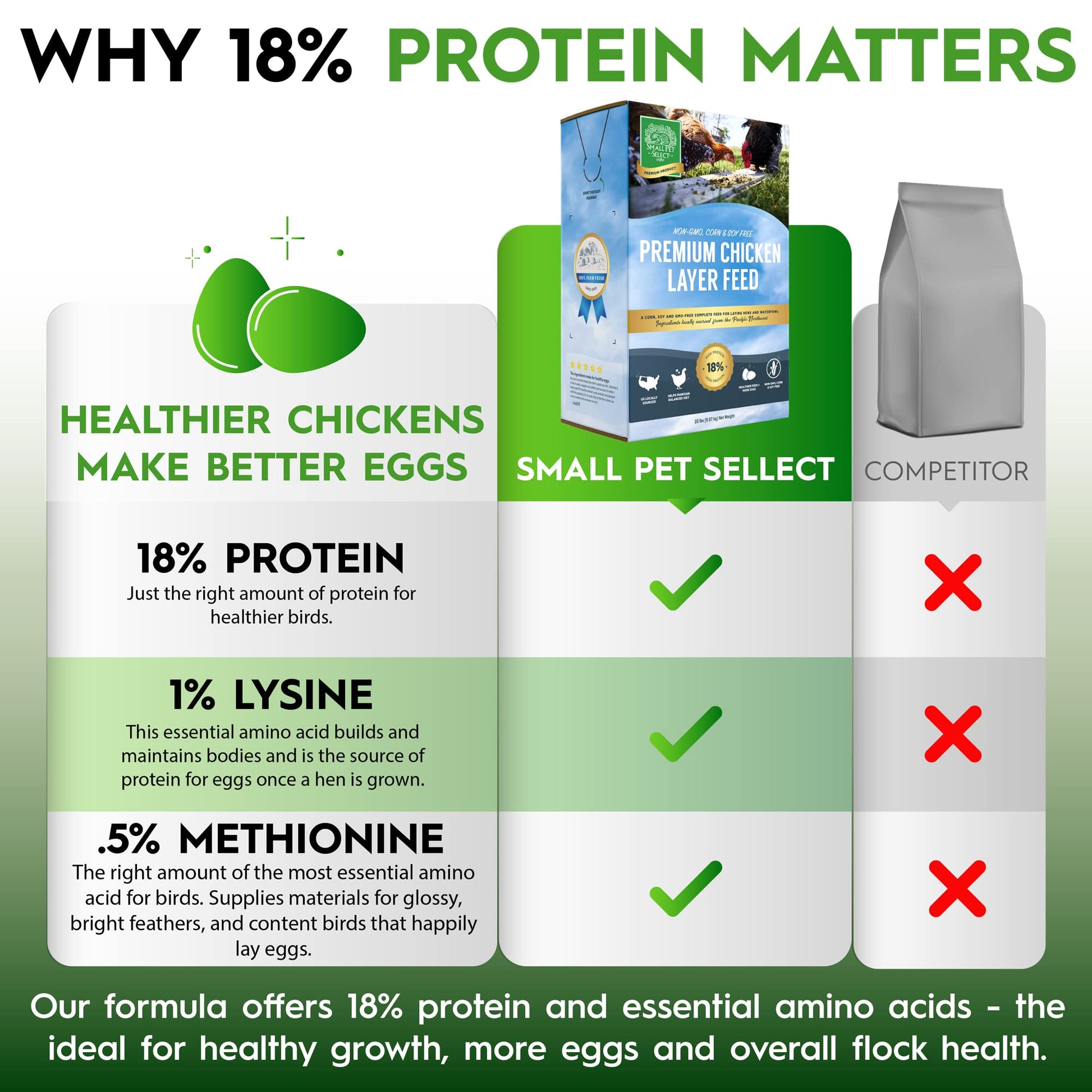 - High Protein Blend – Contains 18% protein with sunflower, pumpkin, and flax seeds, plus added calcium for strong eggshells and egg production.