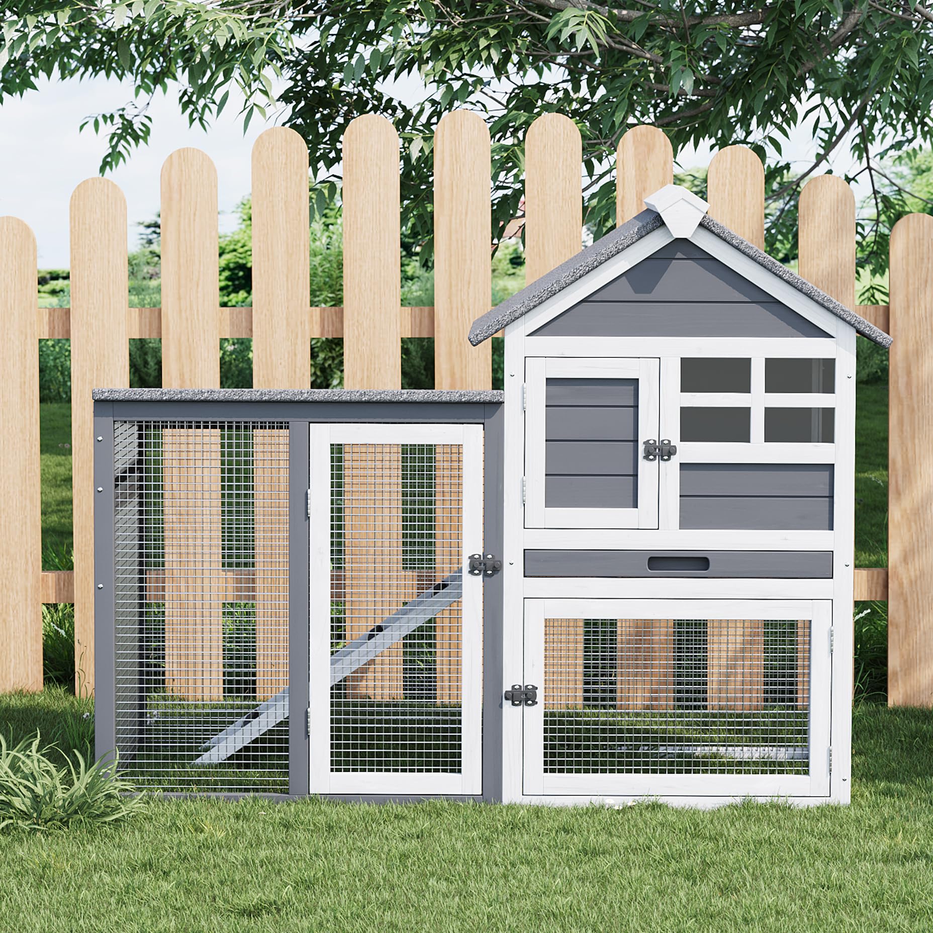 Small Wooden Chicken Coop, 2-Story Rabbit Hutch Indoor Outdoor with Waterproof Roof, Bunny Cage with Pull Out Tray and a Wooden Ramp (45.28" l x 20.08" w x 36.61" h)
