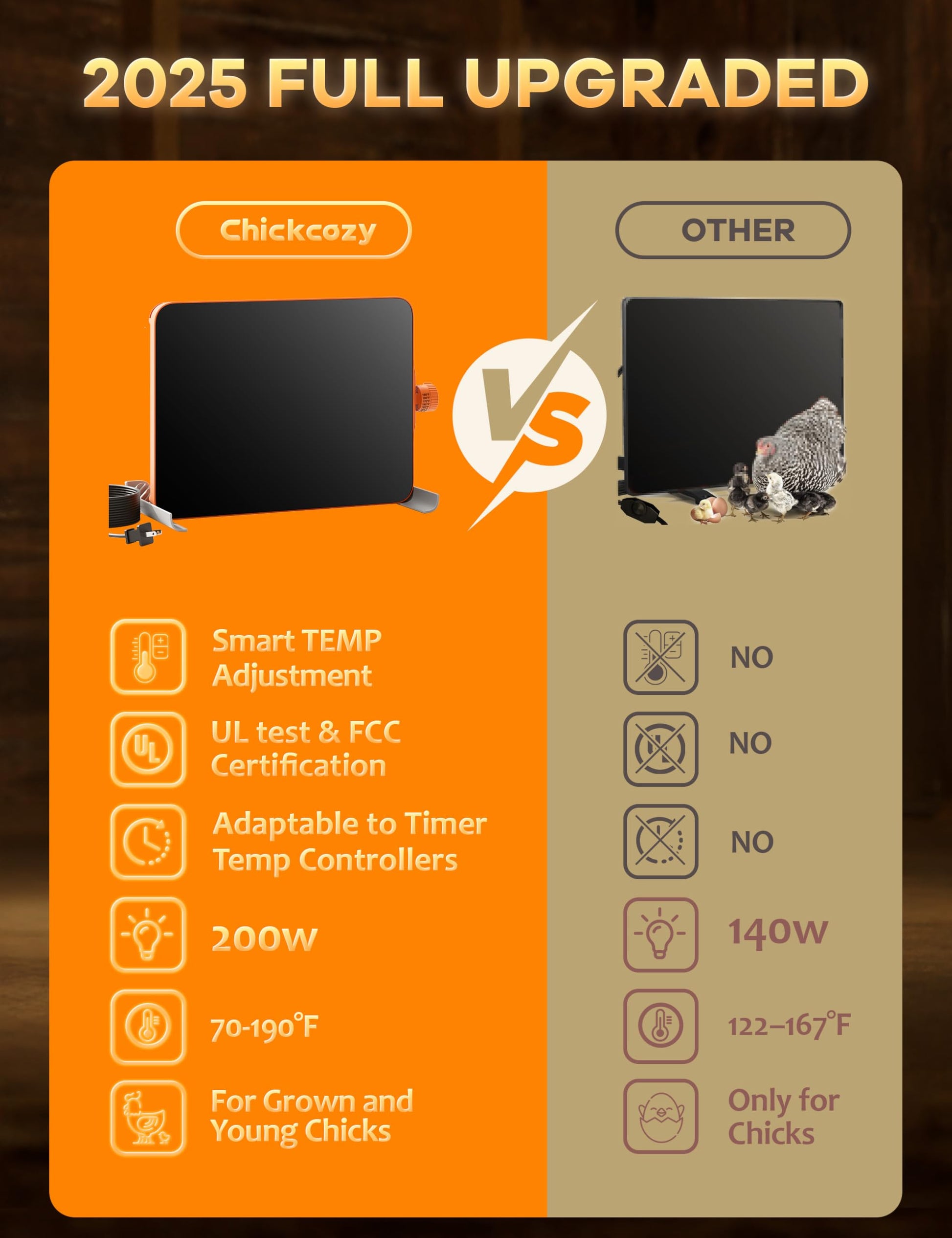 ๐ก๏ธMAXIMUM COMFORT - With a broad temperature range from 70โ to 190โ, this chicken warmer ensures your flock stays cozy, whether theyโre tiny chicks or fully-grown hens. Powered by 200W, it heats up fast, providing immediate warmth when the weather turns cold, giving your chickens the comfort they deserve, quickly and efficiently.