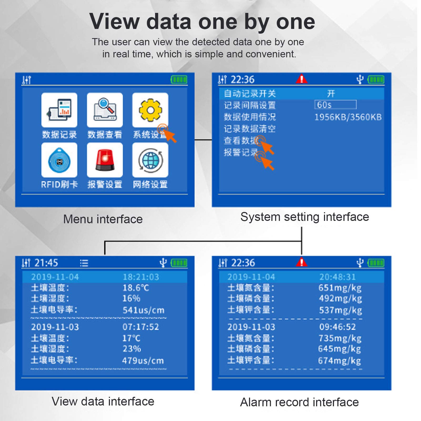☋♣☋【NO SPECIAL SKILLS REQUIRED】This soil pH meter has a large size LCD screen, embedded full‑color interface, can query, record, and display data in real time. Support single digital + meter display, multiple measurement data set display, optional real‑time curve display. with data storage function, support 4MB data storage, you can export data to a computer through Excel, and perform printing, editing, and icon display functions.