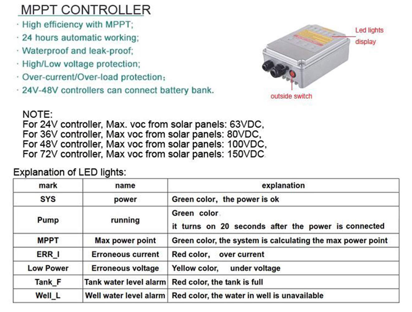 MPPT CONTROLLER: The solar water pump controller drives the high efficient brush-less DC pump motor, utilizing the latest MPPT technology to ensure maximum flow is delivered under all light conditions. It also protects the submersible pump from frequent start up in low light conditions, overheating & running dry.