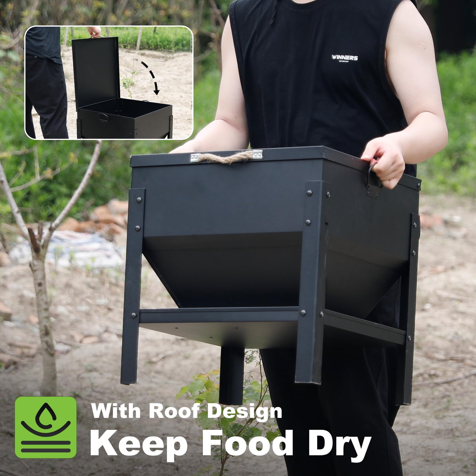 [Waterproof Lid] - No more worries about rain or spills. Our feeder features a durable, waterproof lid that keeps the feed fresh and dry, ensuring your chickens always have access to the best quality food.
