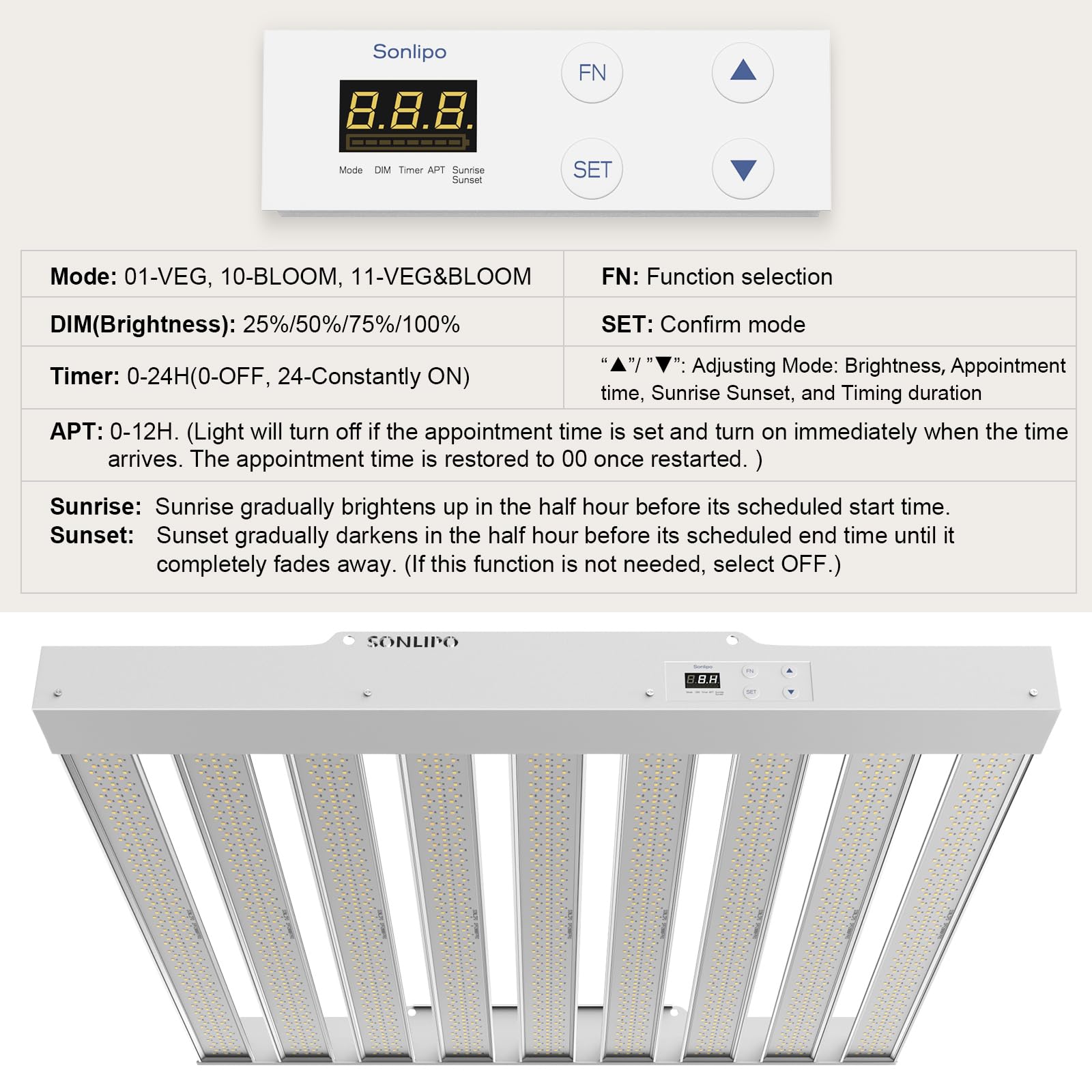 Professional 3-Stage Full Spectrum: Sonlipo plant light is designed with 3 types of Sunlike full spectrum to meet the different growth stages of plants, including Seeding, Vegetative, and Flowering & Fruiting stages. This increases plant yield to a maximum of 2.9 g/w. The 3 full spectrum modes are controlled by a panel (VEG, V&B, BLOOM), suitable for all plants and all stages of plant growth.