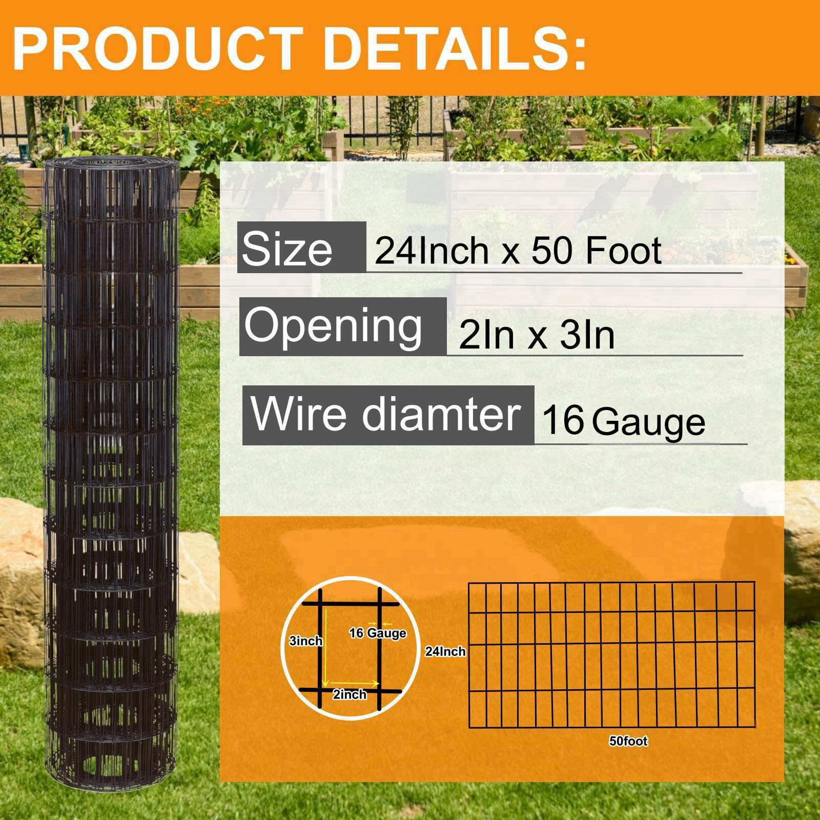 【Easy to Install】Unlike chain-link fencing, the pre-welded fence panels simplify the installation process, allowing for efficient and straightforward assembly. It's 24 inch x 50 FT, mesh size 2"x3" openings 16 gauge. Please pay attention to the length and mesh size.