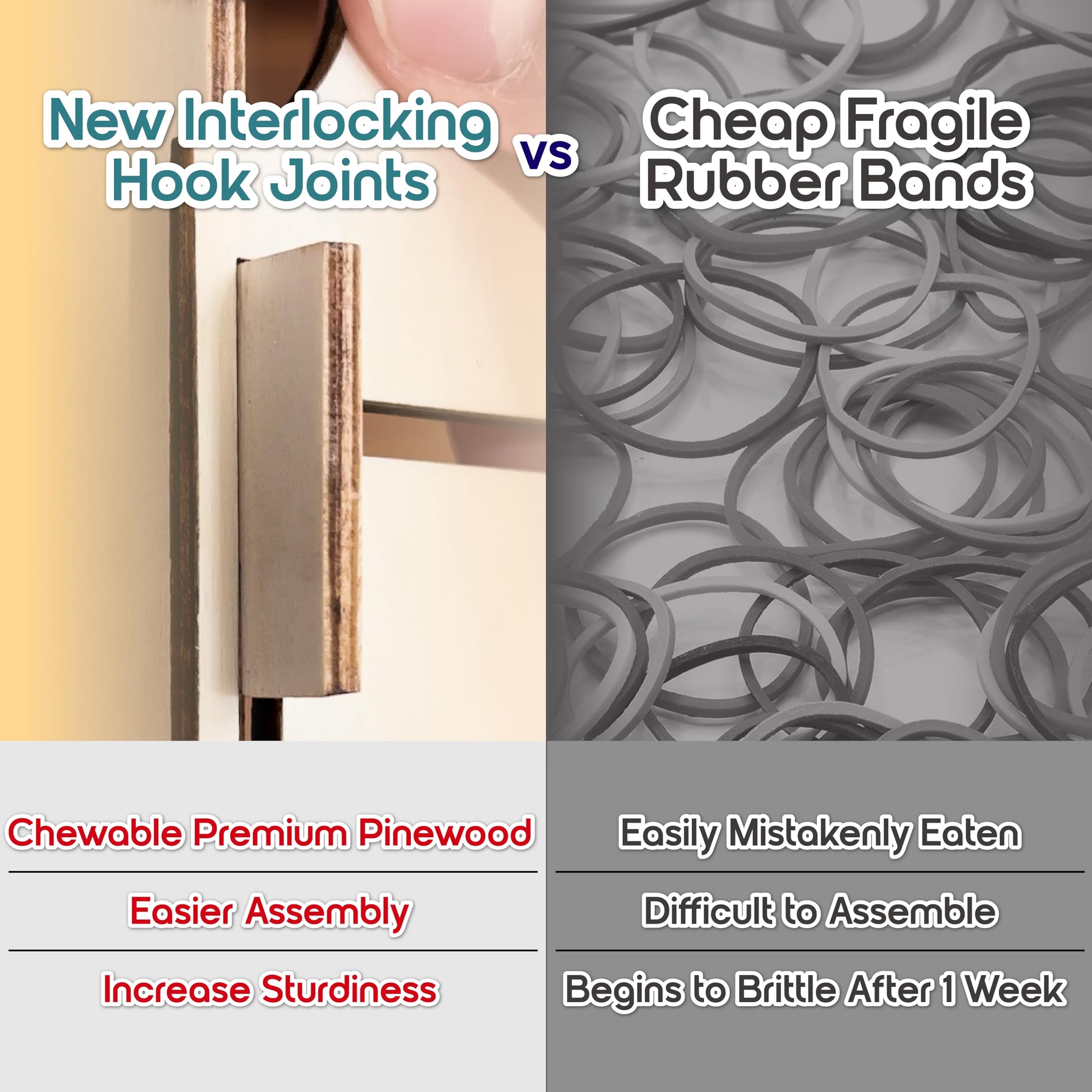 🐰 【 Safety Measure 2: Premium Quality Pinewood 】 All SoulThink : Pets utilizes the finest native Sugar Pine grown in the Californian Mountainous Region . Different from Poplar , each piece of Pinewood used not only is chewable , but the high altitude environment of the mountains also makes it naturally more durable . Making the Rabbit Castle Safe and Extra Sturdy