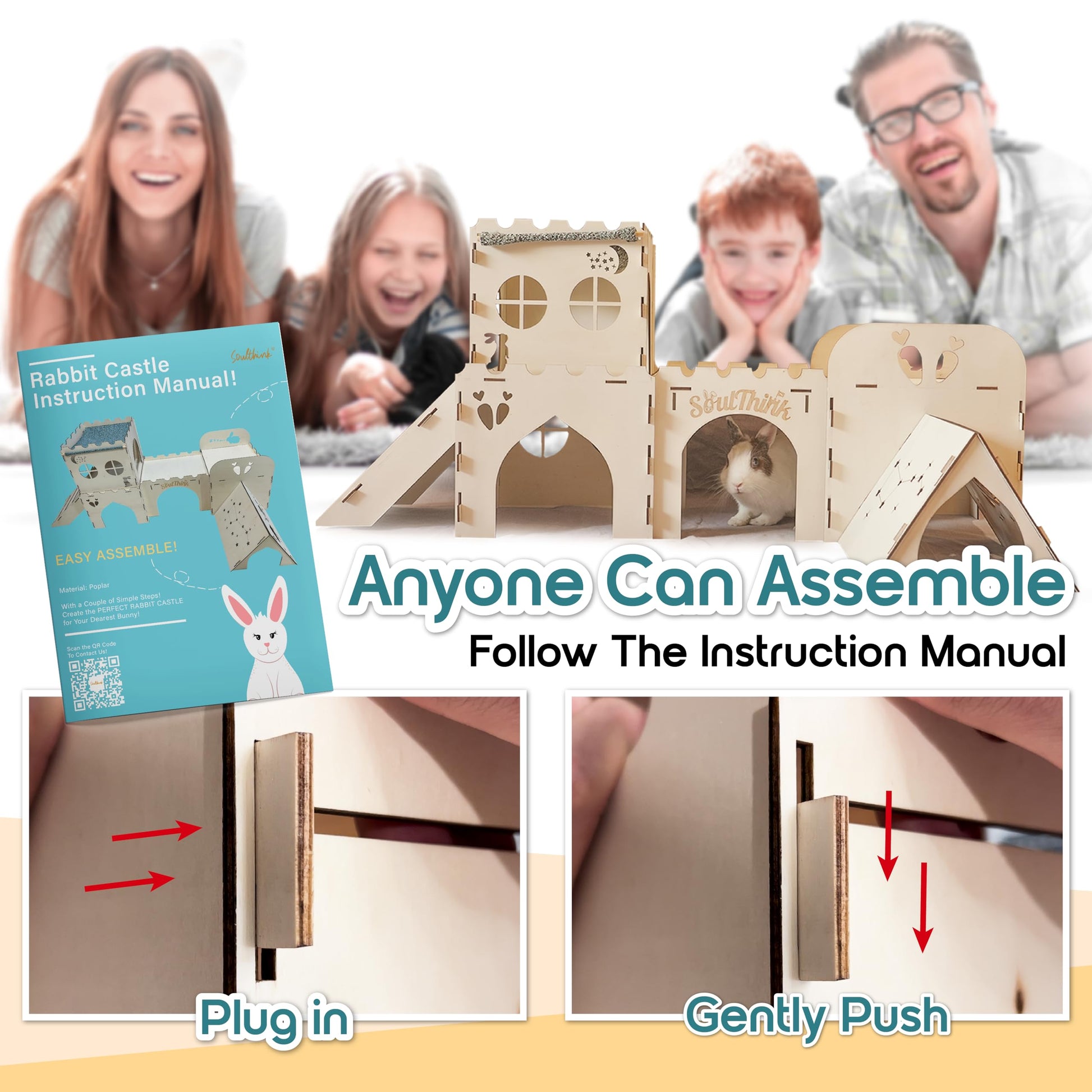 🐰 【 Make Building Effortless ! 】 Imagine the hassle of placing over 100+ tight rubber bands to secure the rabbit castle . SoulThink presents the newly designed interlocking hook joints that offer much better stability and could be easily installed even for children . Follow along with the instruction manual and build your castle with ease