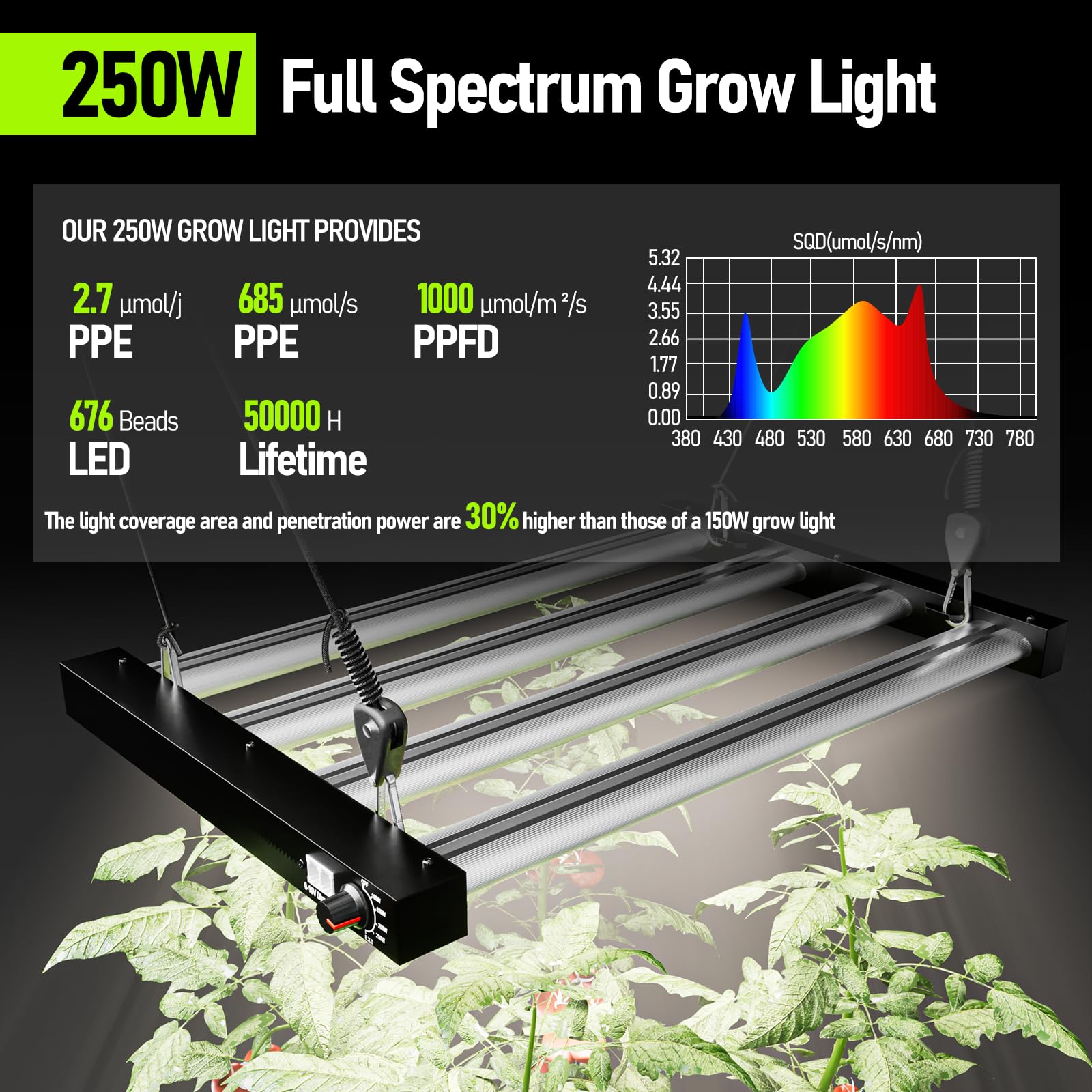 250W Full Spectrum Dimmable Grow Light: The full spectrum illumination is closer to natural light and can meet all the lighting and morphological development needs of plants at different growth stages. The maximum power of the grow light is 250W, with 676 LED beads, which is higher than most grow lights, allowing for a wider coverage range and higher light intensity