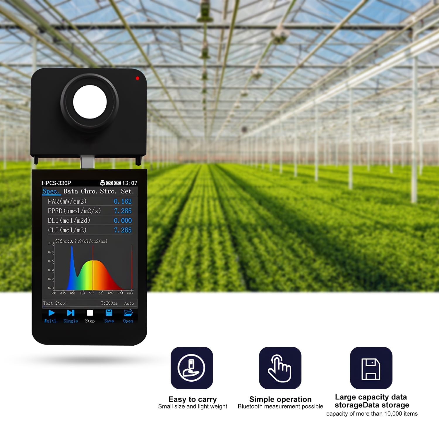 Advanced Optical and Sensory Technology: Equipped with a high-precision CCD sensor and a compact crossed Czerny-Turner (CT) spectroscopy system for unparalleled accuracy in light measurement. This device captures detailed spectral information across a wavelength range of 350 to 800 nm, ensuring precise light condition assessment for various sources including LED and natural sunlight.