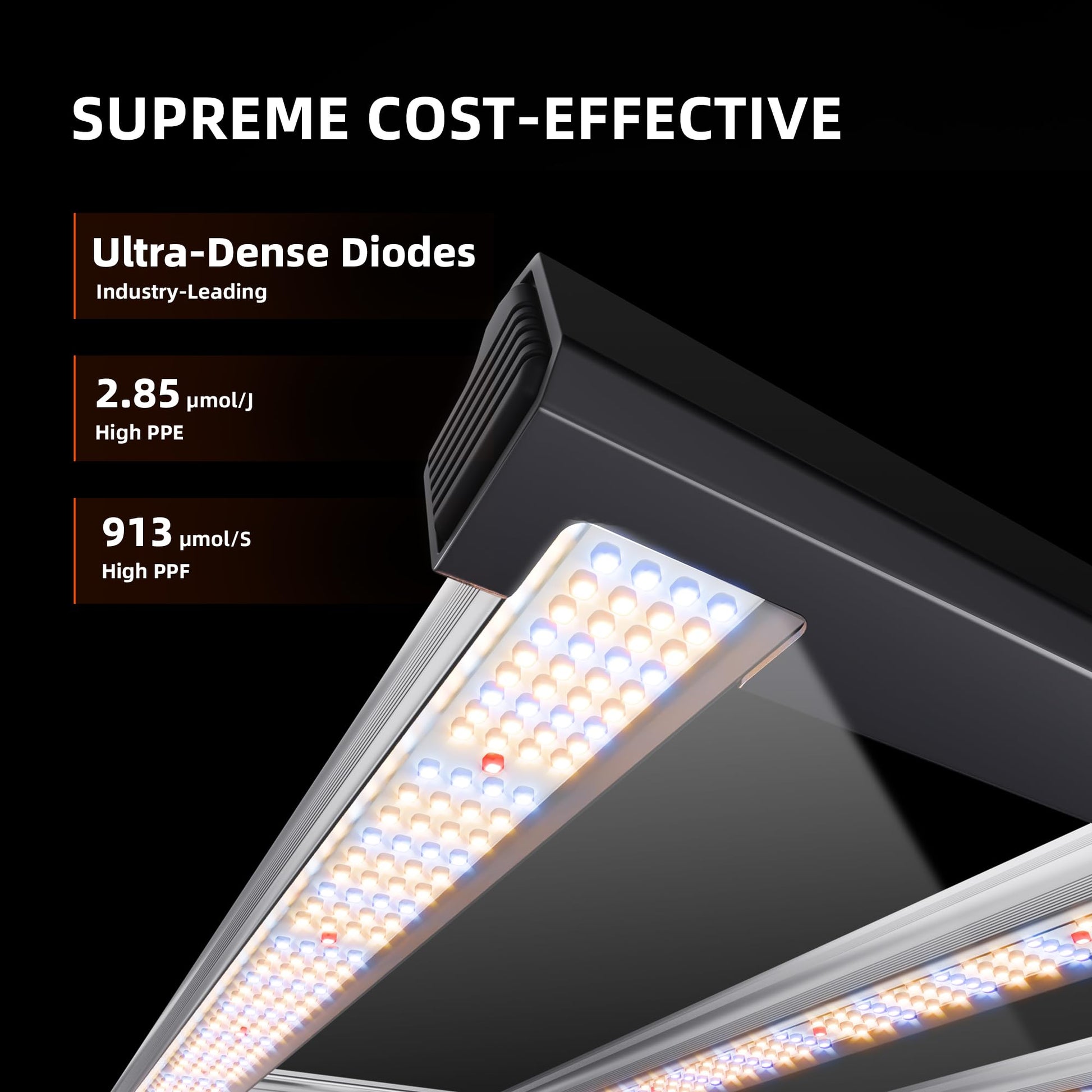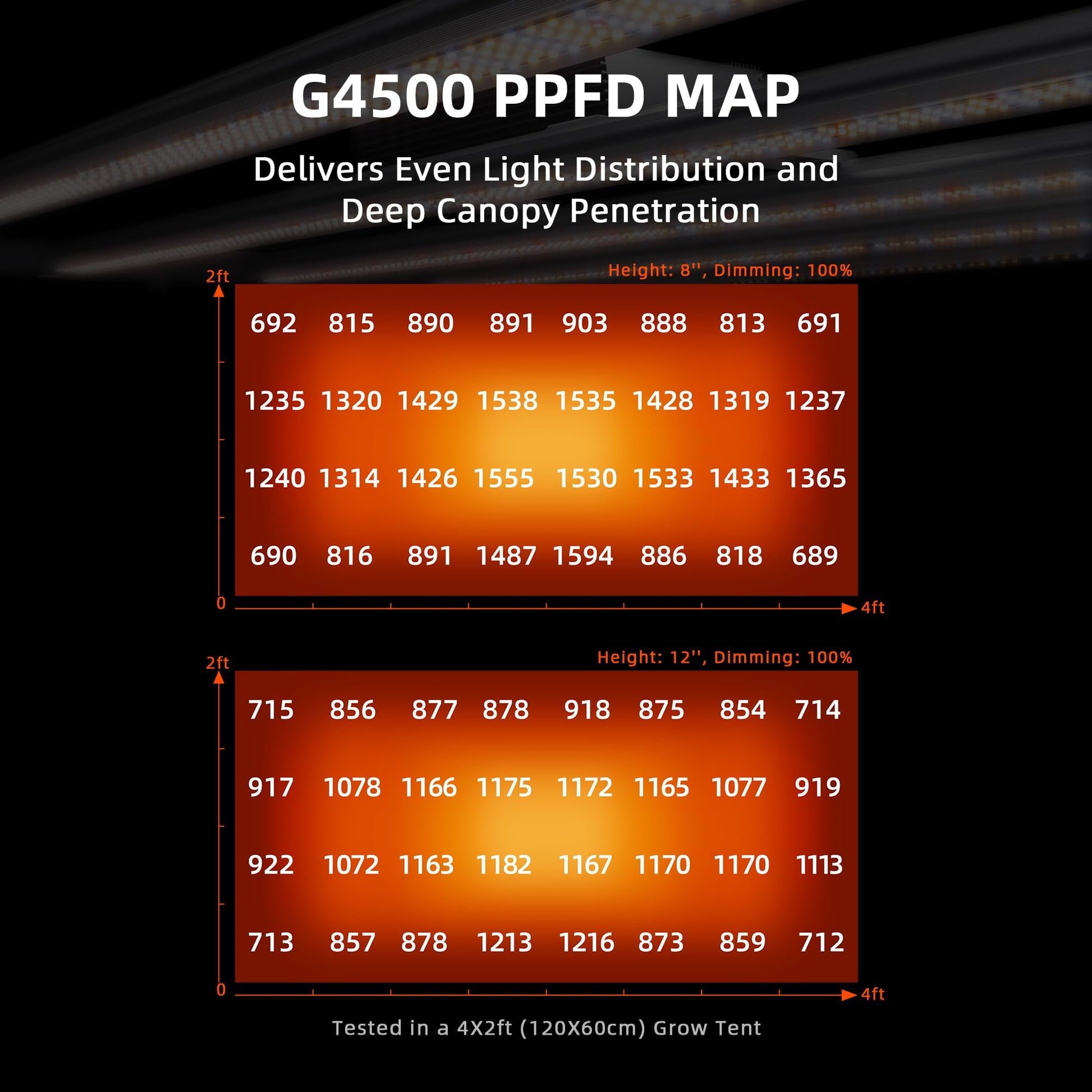 【MAXIMUM EFFICIENCY AND UNIFORM LIGHT】The Spider Farmer G4500 led grow light has a unique elongated light bar design that provides more uniform and comprehensive canopy coverage, especially at the edges of the cultivation area. With high efficiency bridgelux diodes, the G4500 LED grow light is able to obtain 320 watts of power, achieving an impressive PPE of 2.85 umol/J, covering 3x5 feet or 2x4 feet of high-yielding full-cycle growth