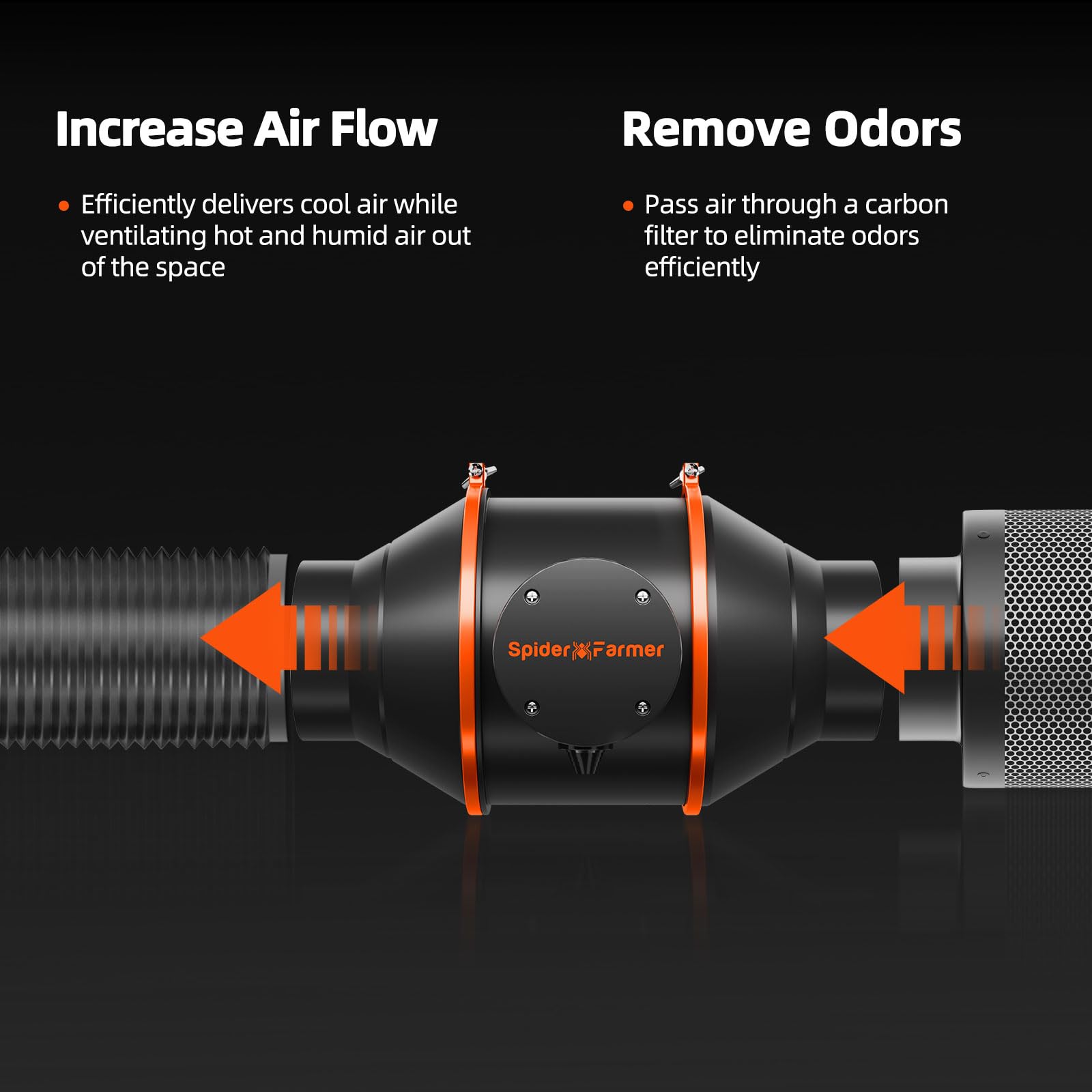 POWERFUL VENTILATION SYSTEM: Quiet and low noise (26.8 dB) 4” Inline fan 205 CFM airflow with RC412 activated carbon filter and flexible duct. Provides excellent air circulation and eliminates odors. Clip fan delivers airflow ranging from 0 to 2500 RPM, flexible rotation quick circulation cooling, and customizable 10 speeds for all plant growth stages