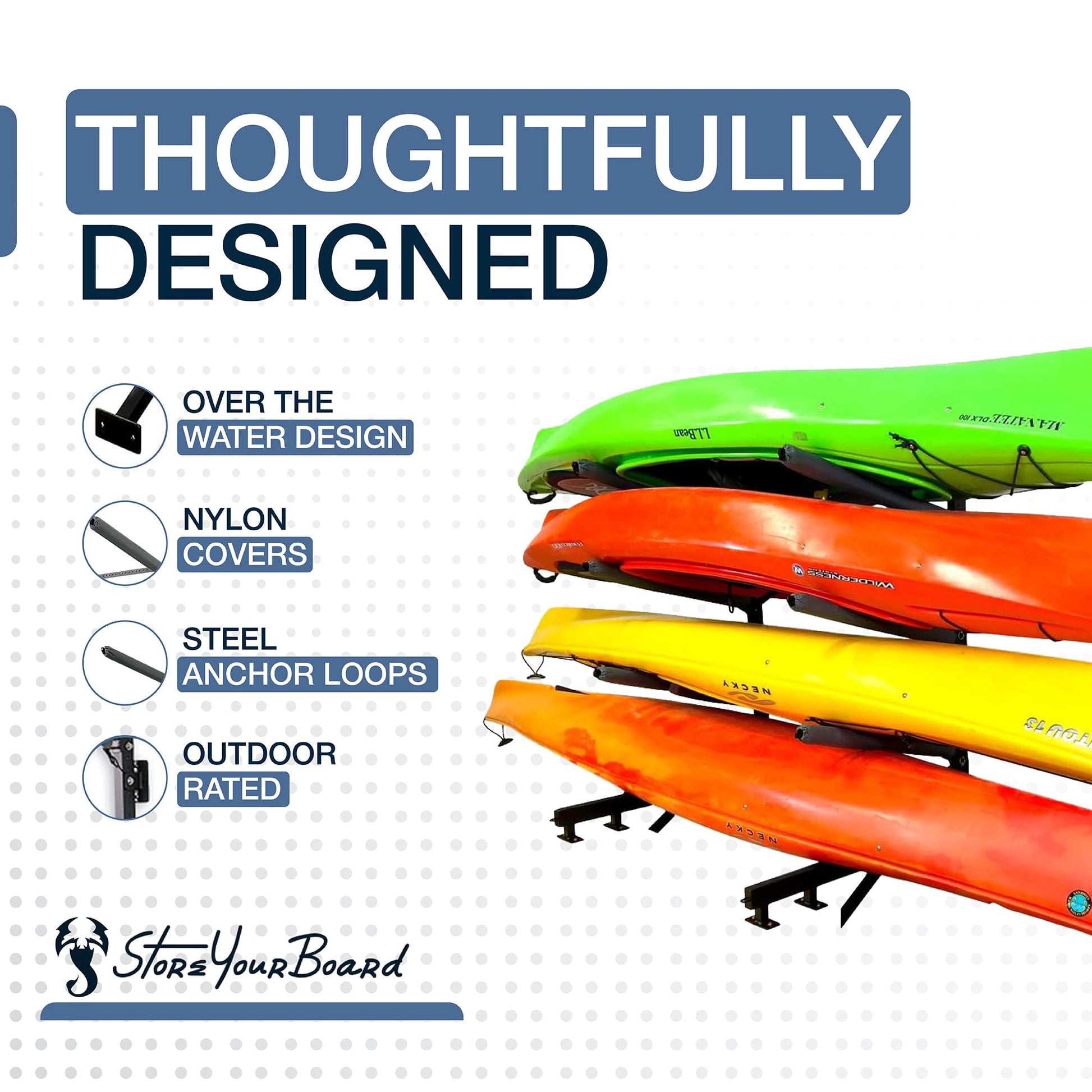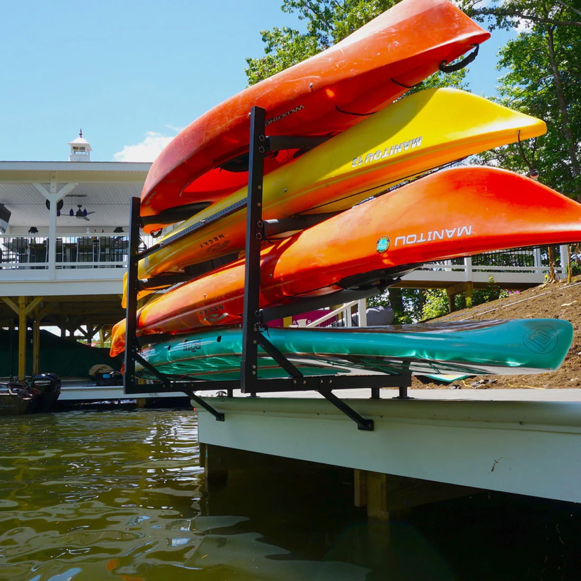 Outdoor Kayak Dock Storage: Holds up to 4 kayaks outdoors for easy to access waterside storage!