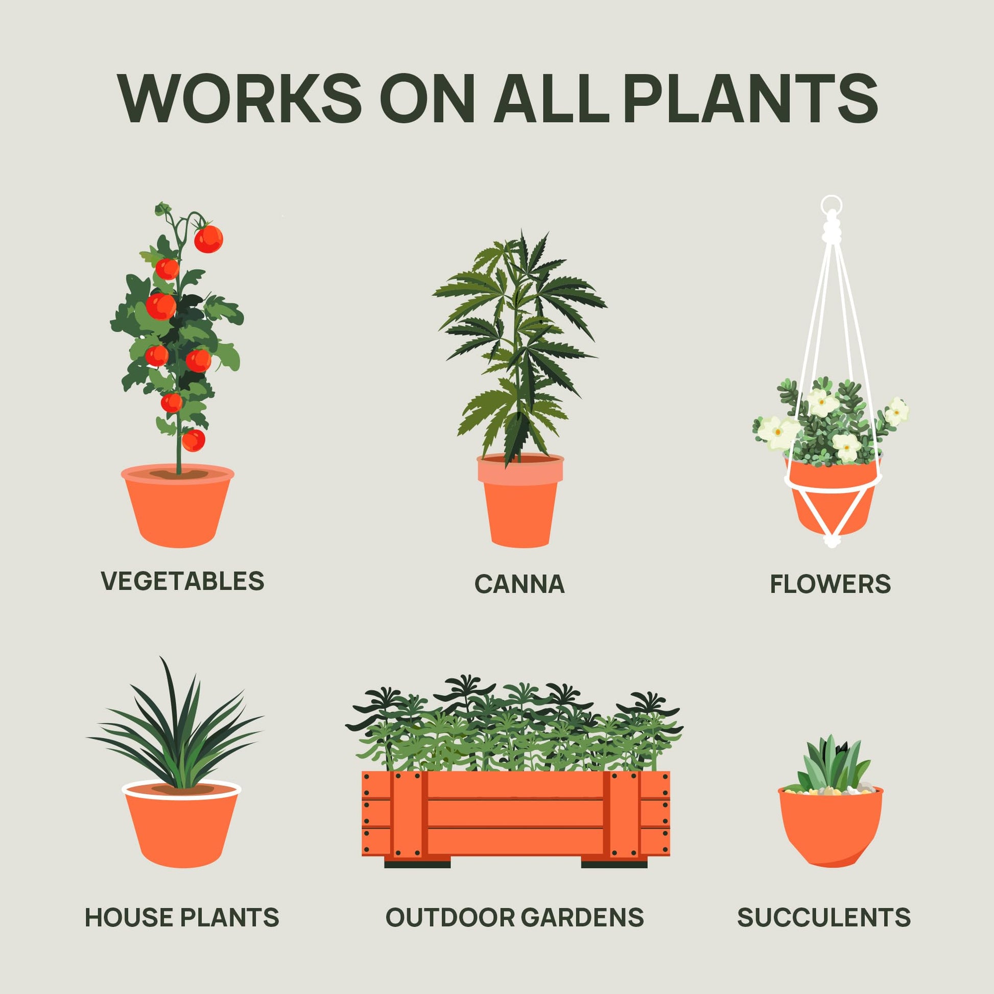 Strive's formula is compatible with all plants, including indoor/outdoor varieties, houseplants, vegetables, bamboo, succulents, and flowers such as roses and orchids. It works effectively in all gardening environments, whether hydroponic or soil-based, and in various growing mediums such as Promix, aerogardens, autopots, potted plants, coco coir, etc.