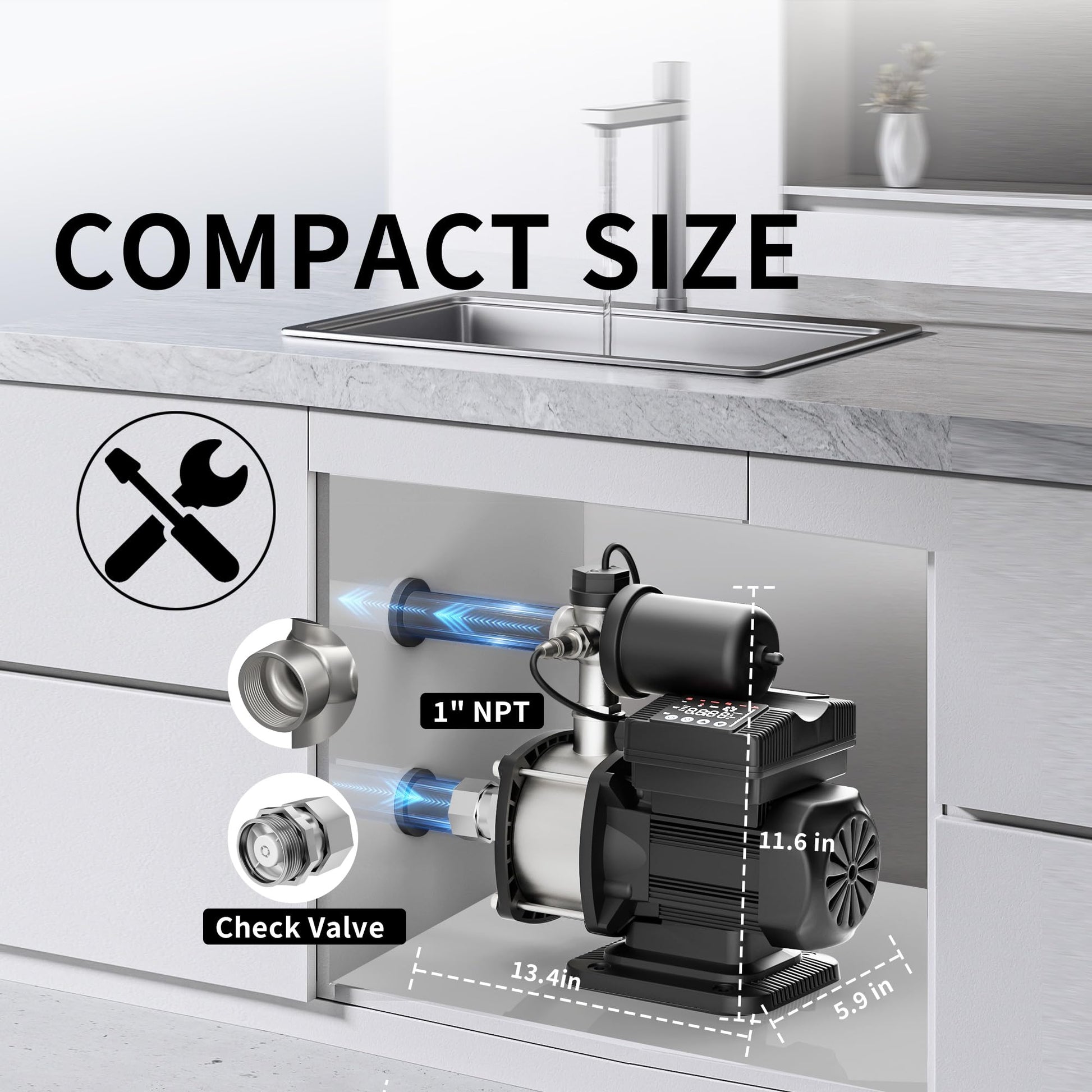 Powerful Whole-House Water Pressure Boost : Max power 3/5 HP (450W) motor delivers 1268 GPH (21.13 GPM) flow rate & 57 PSI (4 Bar) pressure & 131 Ft head — simultaneously supplies 7 faucets across 3 floors without drop-offs. Perfect for showers, sinks, and appliances in multi-story homes.