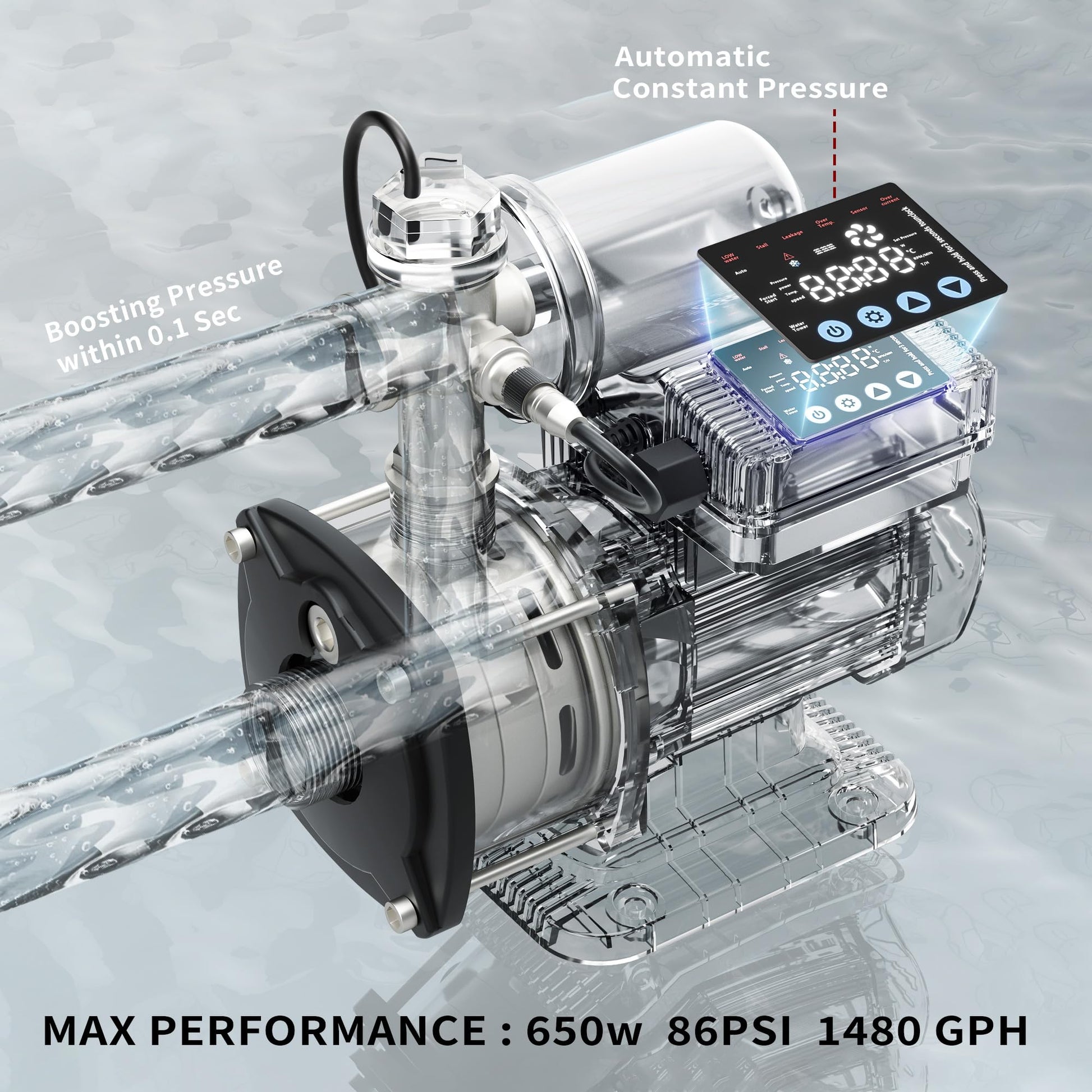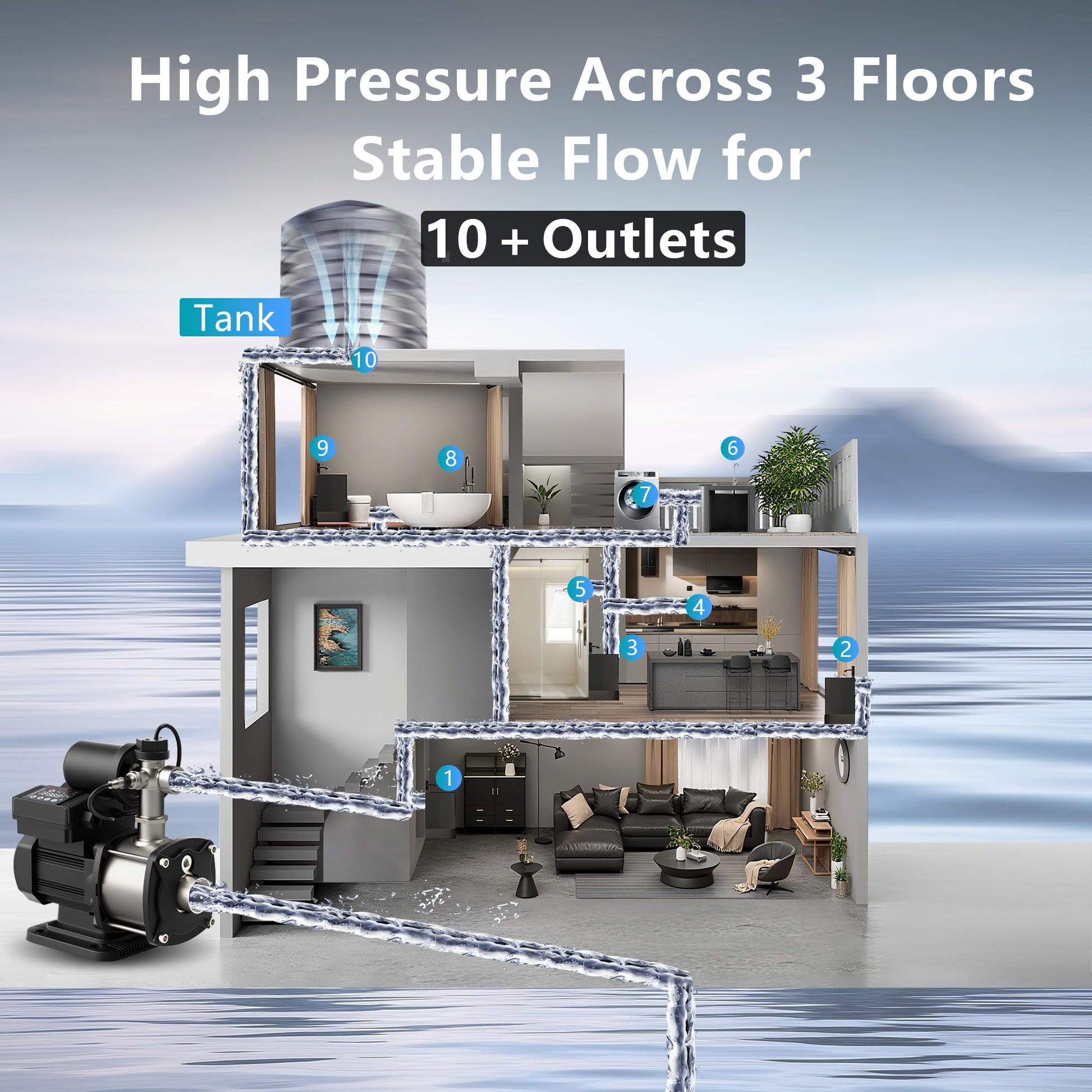 Powerful Whole-House Water Pressure Boost : Max power 0.87 HP (650W) motor delivers 1480 GPH (24.67GPM) flow rate & 86 PSI (5.93 Bar) pressure & 197 Ft head — simultaneously supplies 10 faucets across 3 floors without drop-offs. Perfect for showers, sinks, and appliances in multi-story homes.