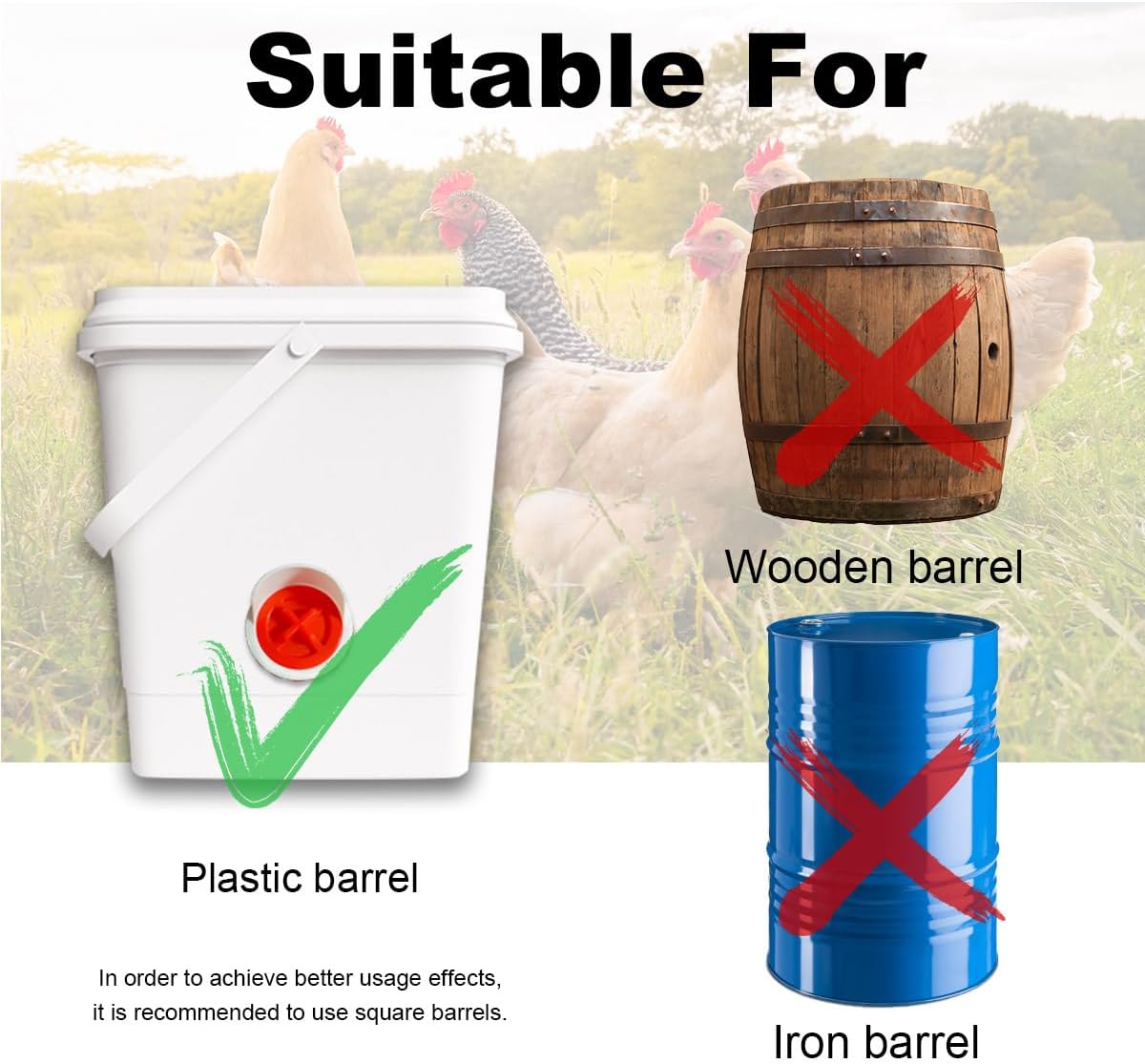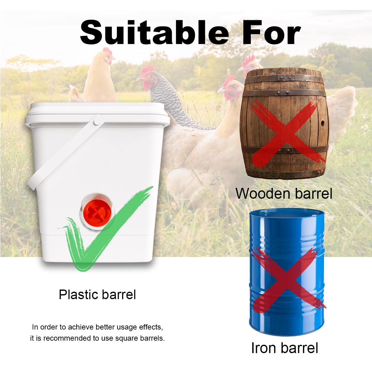 EASY TO INSTALL:The poultry feeders for chicken come with 1 hole saw;Drill holes on the bucket and insert the ports,tighten with screw on bushings to be ready. Any container that is convenient can be easily transformed into an automatic chicken feeder