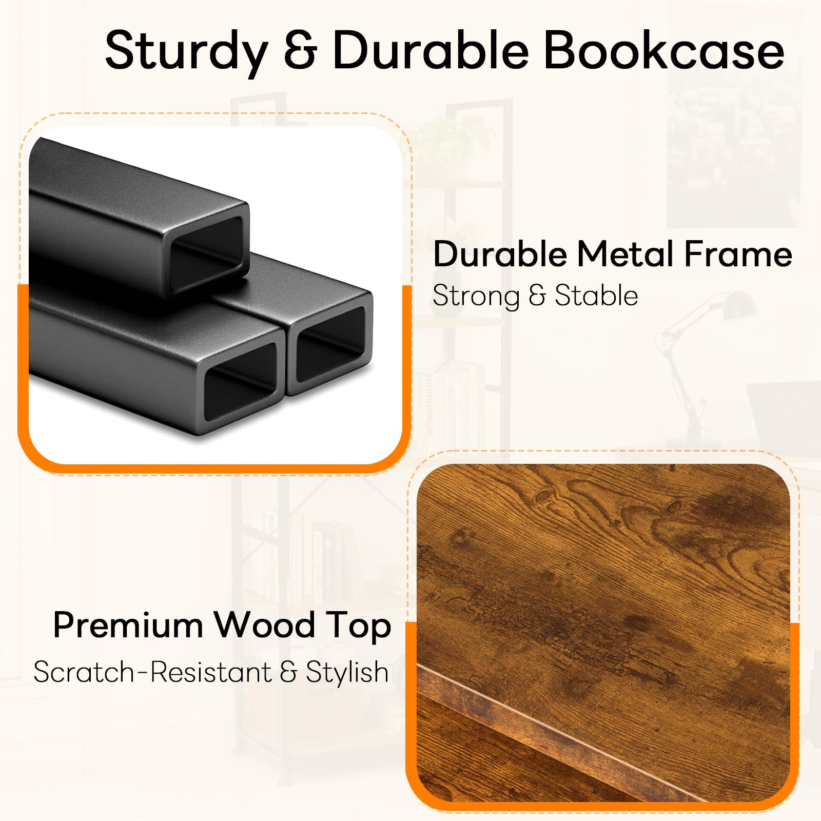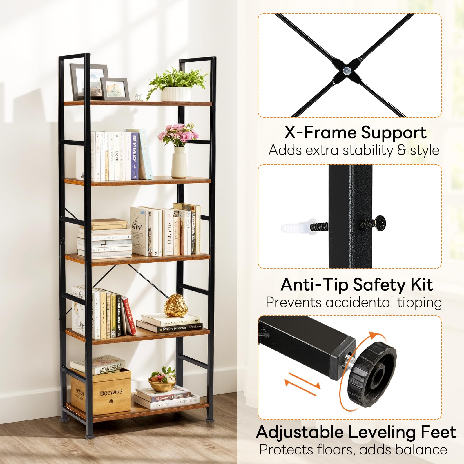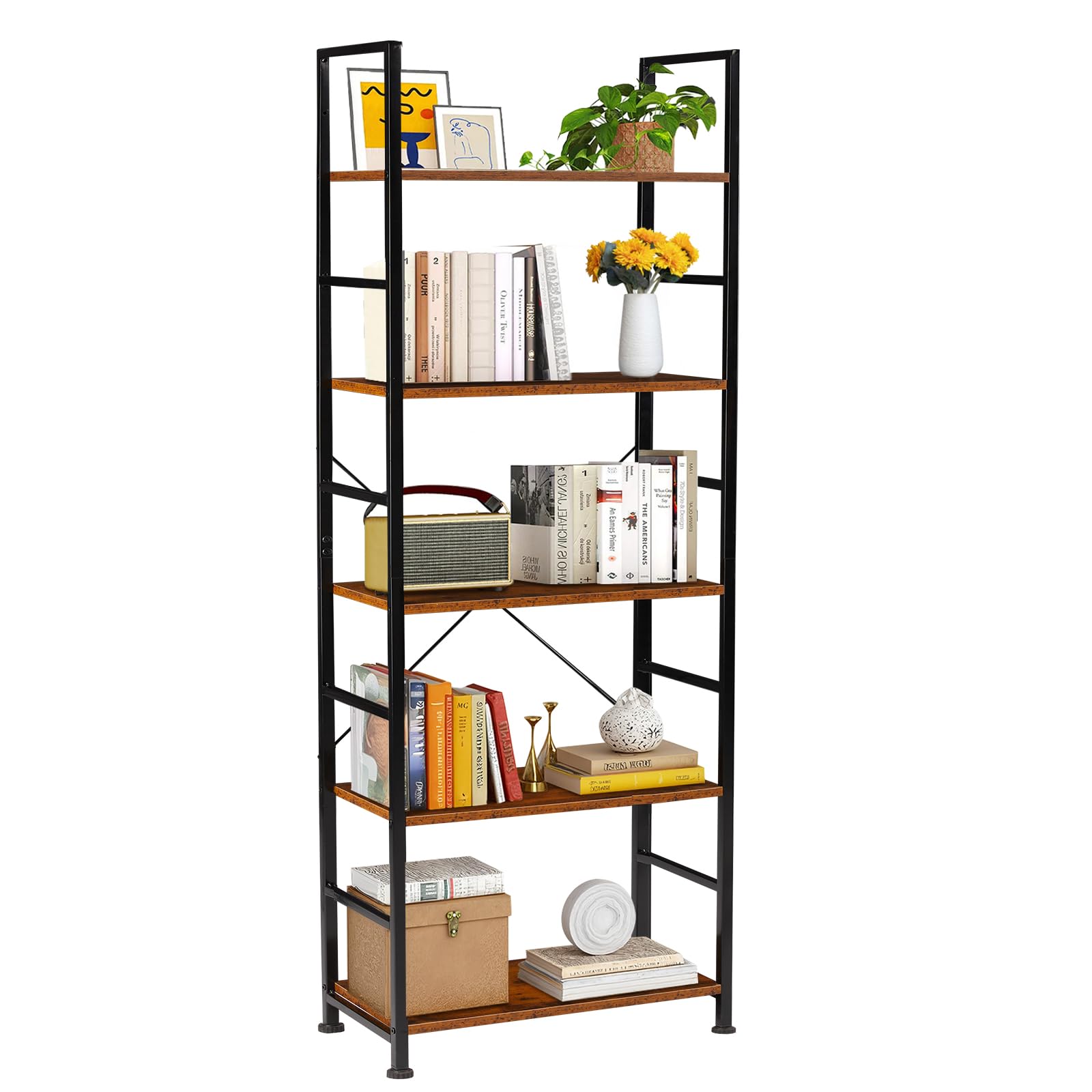 Sweetcrispy 5-Tier Industrial Bookshelf, Rustic Wood and Metal Bookcase with Open Shelves, 62.2-Inch Tall Storage Rack for Living Room, Home Office, Bedroom, Display and Organization, Brown