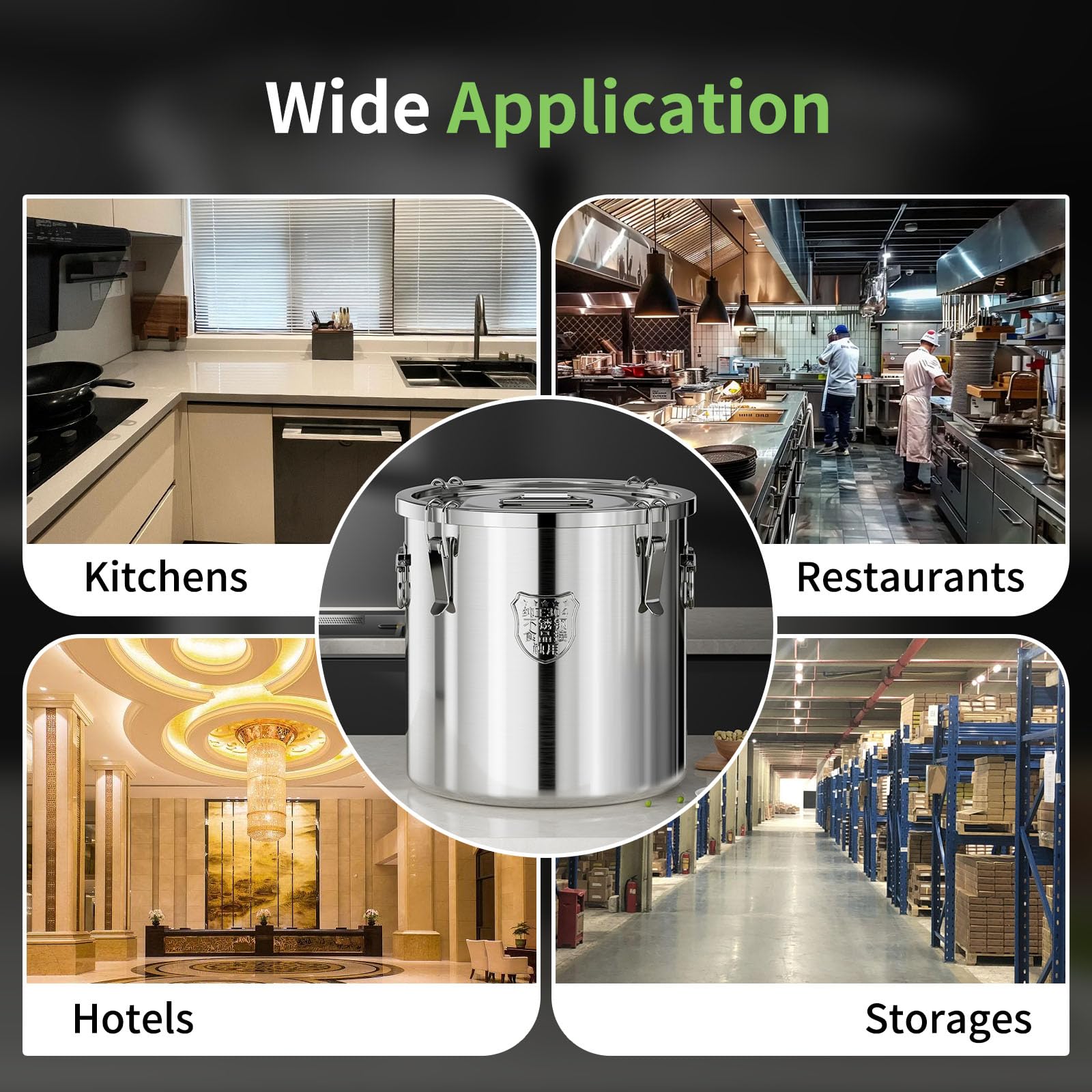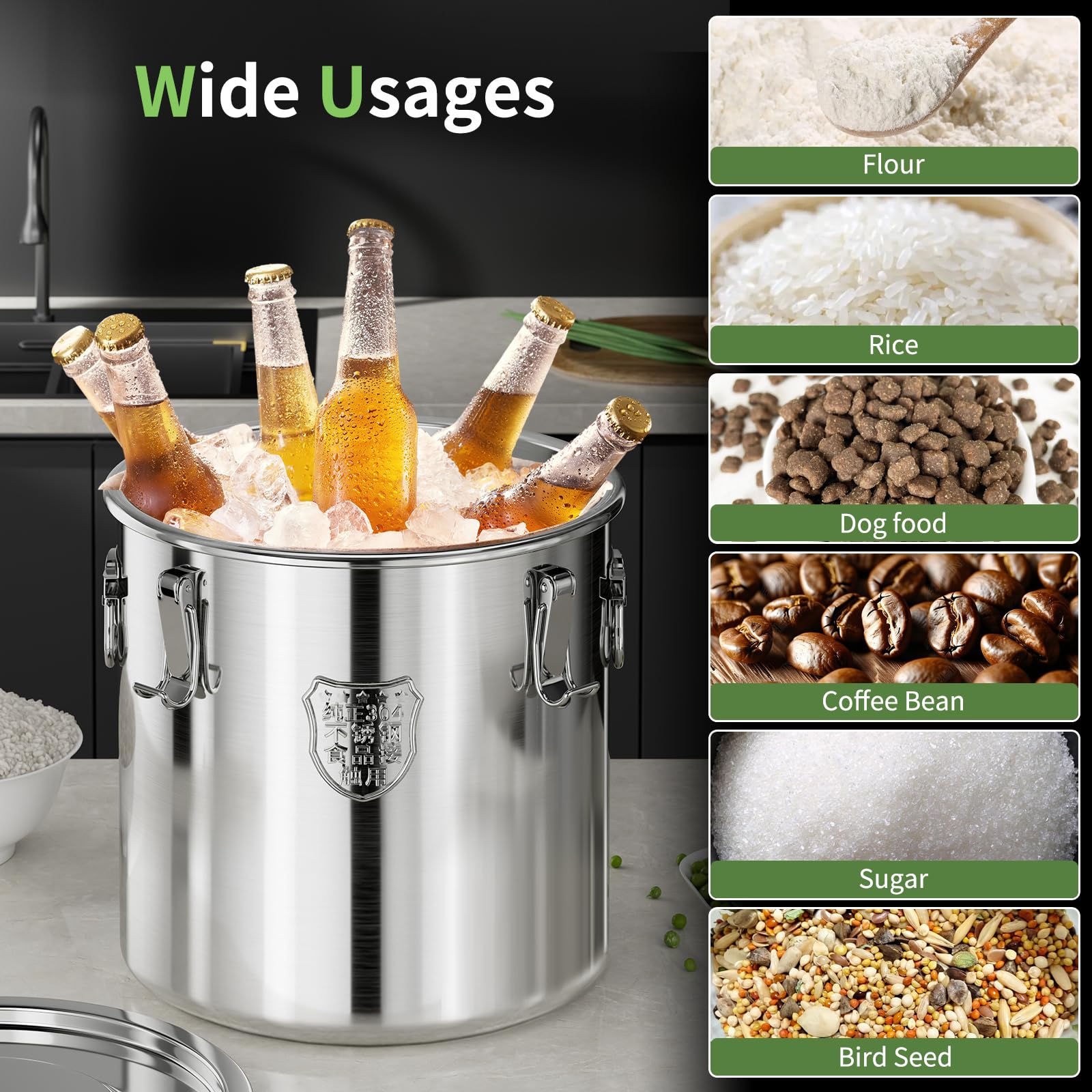 Wide Usages:our stainless steel Bucket with lids is Suitable for storing Wide dry/wet items,such as rice,flour,Sugar,cereals,tea,coffee beans,dog food,etc,in hotels,restaurants,kitchens,warehouses,Pet store,etc