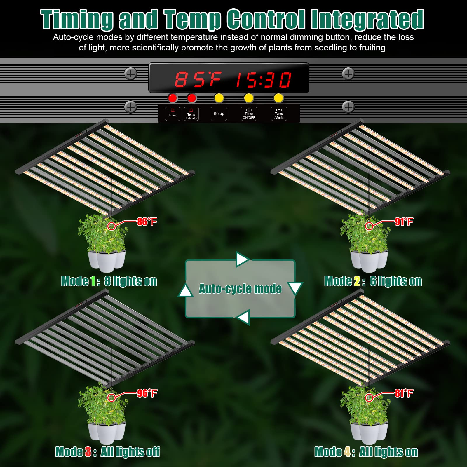 【Temp Control and Timer Modes】- Upgraded PT series with temp sensor, temp button and timer button. The light hanging height can be adjusted properly, plants will get more PPF value, no more electricity will be wasted. Auto setting Temp is 85 ℉; When temperature is up to 86 ℉ 8 light bars on; When temperature is up to 91 ℉ 6 light bars on; When temperature is up to 96 ℉ the light would be turned off.