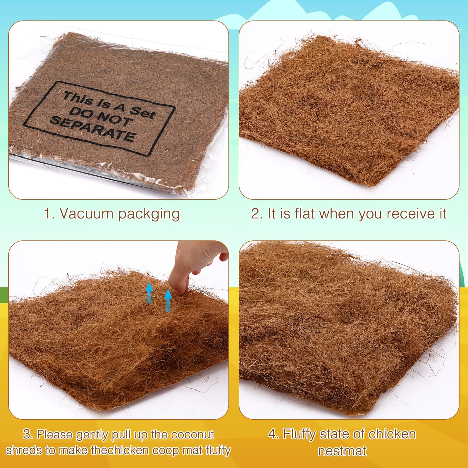 Nesting Boxes Set for Laying Eggs: our chicken nest boxes are made of nest boxes and 3 coconut shredded chicken nest mats; The nest boxes are nice for most large hens and other poultry breeds; Our chicken nest boxes are not only durable but also easy to clean, ensuring long term use in your farm or chicken coop; Before using the mat, please use your hands to push up the coconut shreds to make this mat fluffy