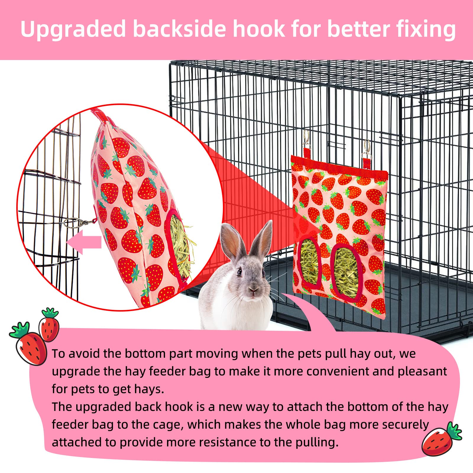 Upgraded Practical Design: 1)Upgraded backside hook is a new way to securely attach the bag bottom to the cage, to avoid the bottom part moving when the pets pull hay out, bringing more convenient and pleasant for pets to get hays. 2)2 stainless steel hooks on top for hanging on almost any cages. 3)Large opening with magic velcro closure for easy hay filling and avoid pets entering from the top; 4)2 Reinforced holes avoid being chewed up easily, and suitable to feed one to multiple small pets.