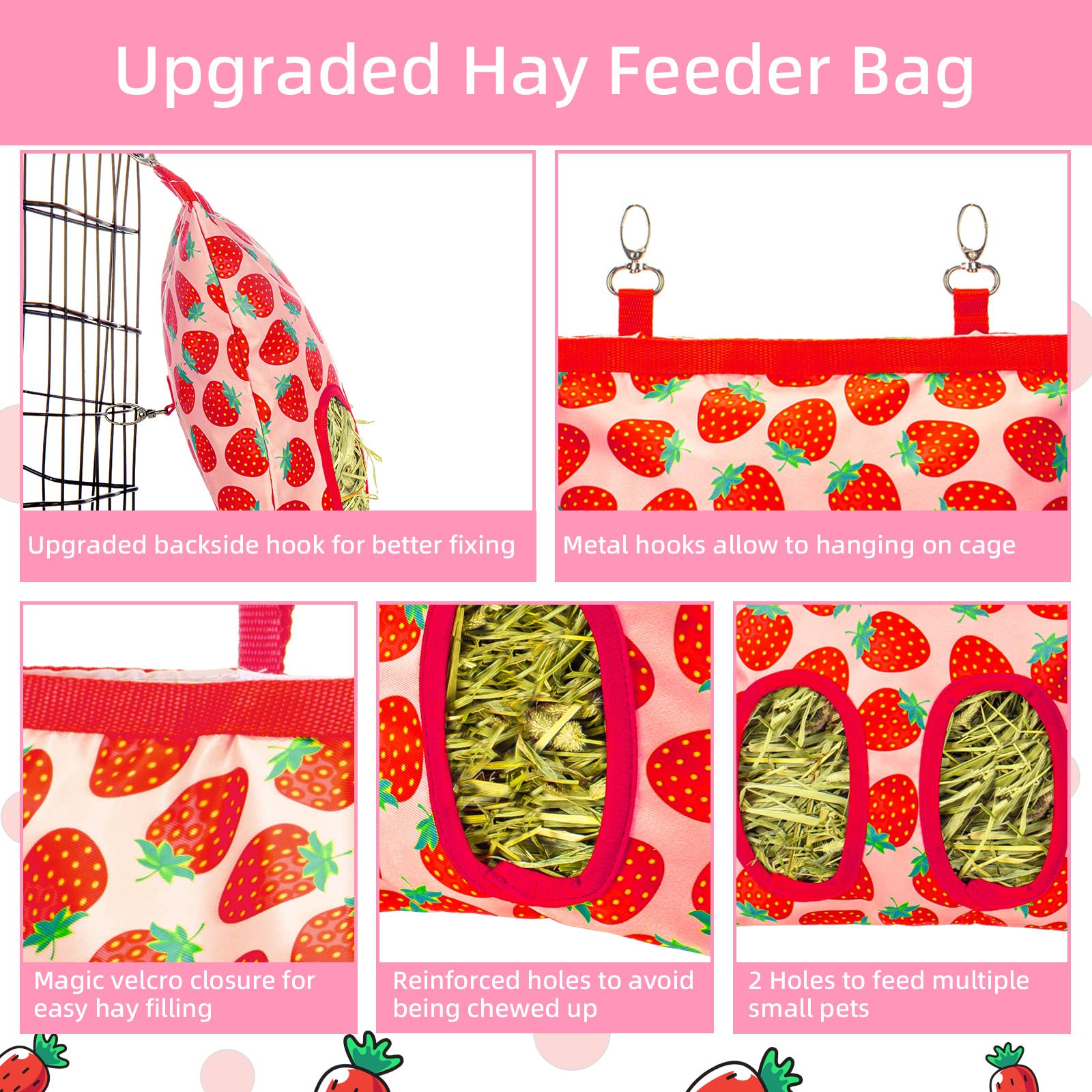 Cute Design & Easy to Use: Turn on the velcro, add hay, make the velcro close tightly, and fix hooks (Please be sure the bag size is suitable to the cage), it's Super Easy to Use; Unique cute patterns bring more personality, which is a great automatic hay feeder gift for rabbits, guinea pigs, hamsters, chinchillas, bunnies, hedgehogs, pet pigs and other small animals.