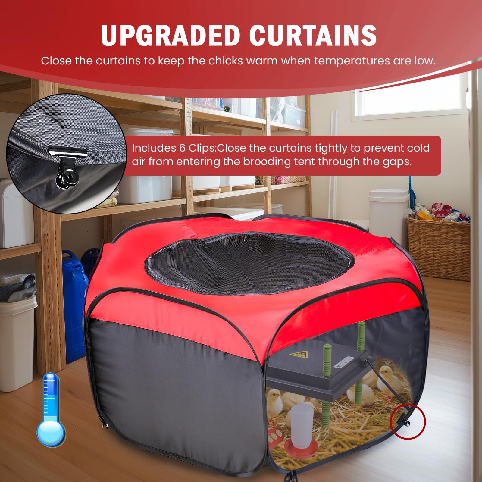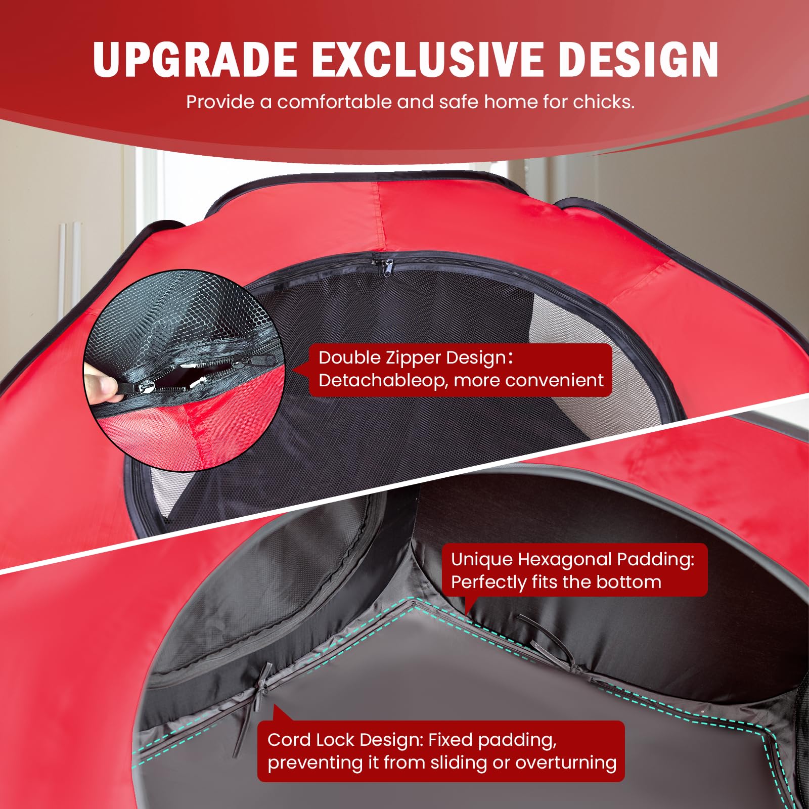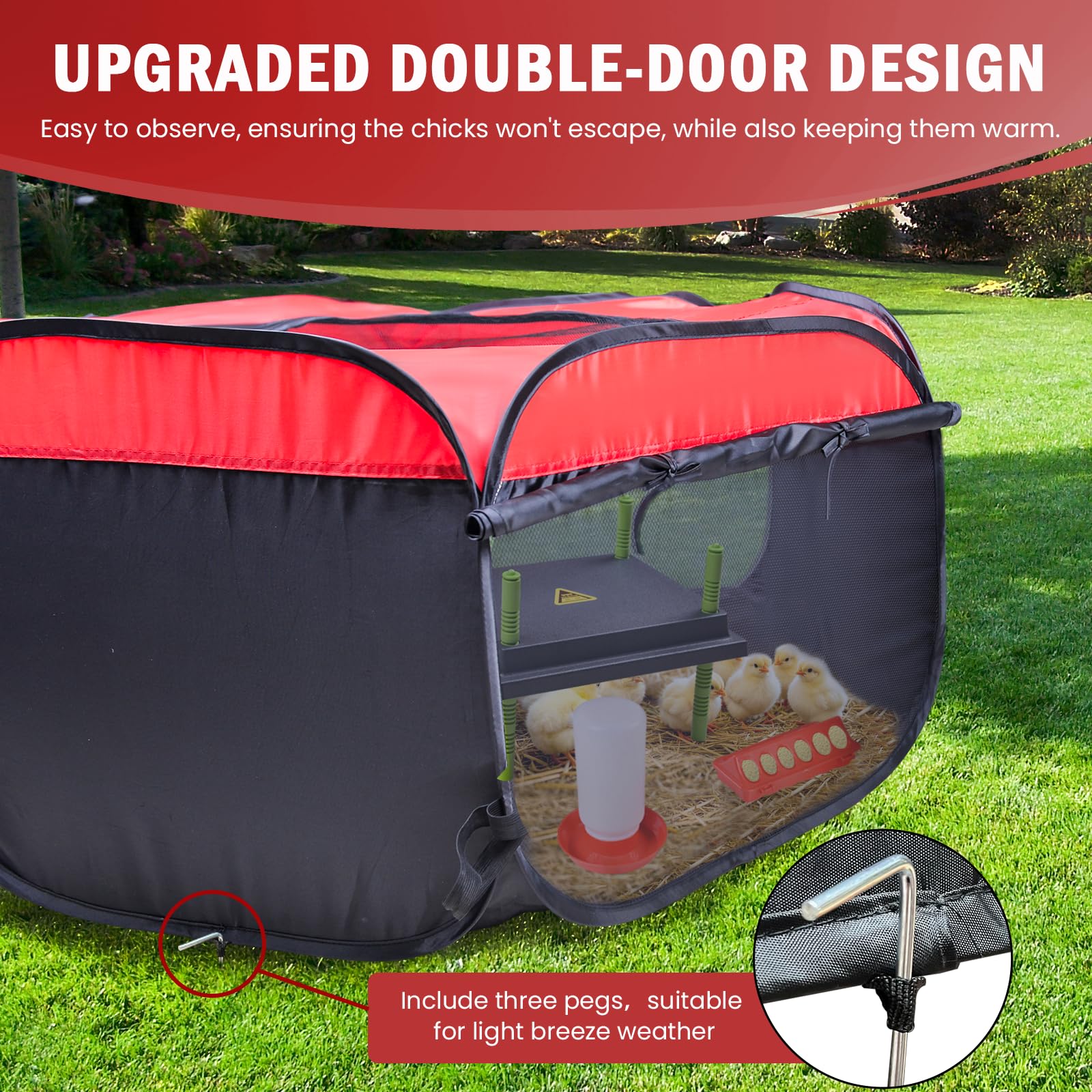 INDOOR & OUTDOOR USE - Perfect for indoor or outdoor settings, this baby chick brooder features an advanced double-door design, three-sided mesh design, and escape-proof mesh. The warm curtains is perfect for outdoor, providing excellent cold protection. Indoors you can open the breathable mesh panels, which offer good ventilation to ensure a cool and comfortable environment. while also preventing the chicks from escaping. This playpen will keep your chicks safe, happy, and comfortable.