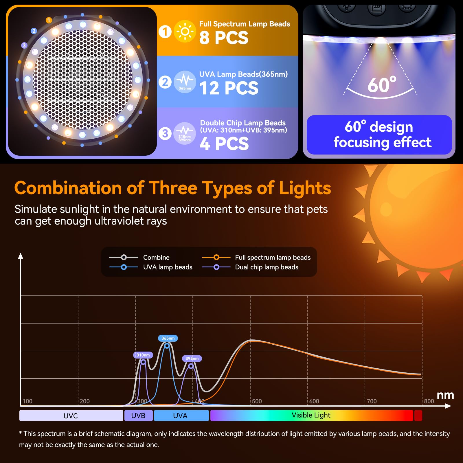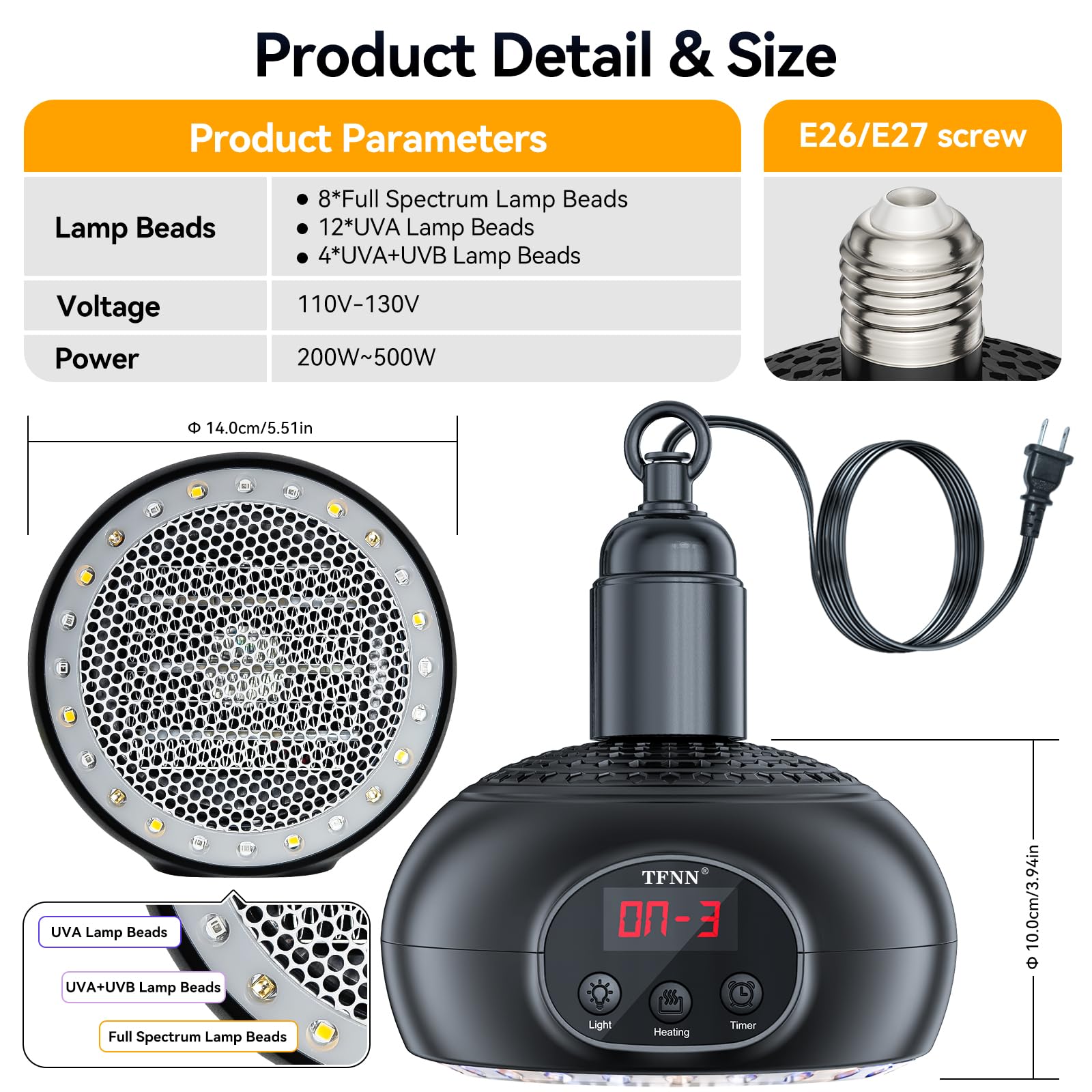 🔥【upgraded Chicken Coop Heater】:TFNN Chicken house heater lamp has 8 full-light bulbs, 12 UVA bulbs (365nm), and 4 UVB bulbs (UVA: 310nm + UVB: 395nm). We will provide you with an additional UV test card. The brightness of the lamp can be adjusted in three levels: low, medium and high. We will provide you with an additional UV test card. Providing the right amount of UVAUVB UV rays for reptiles, dogs, chickens, chicks and other poultry can promote the absorption of calcium, strong bones and healthy growth of pets.