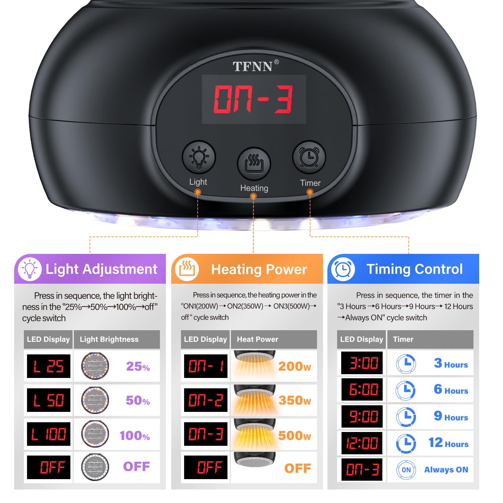 🌟【5-Level Timing Function】:Chicken coop heating lamp with built-in LED digital display timing function, built-in 3H-6H-9H-12H-normally-open timing mode, with timed shutdown function, according to your chicken coop needs, you can flexibly adjust the cycle of heating according to the needs of different situations, to ensure that the chicks are always in a comfortable environment. It can display the gear and automatic shutdown time to save unnecessary electricity expenses.