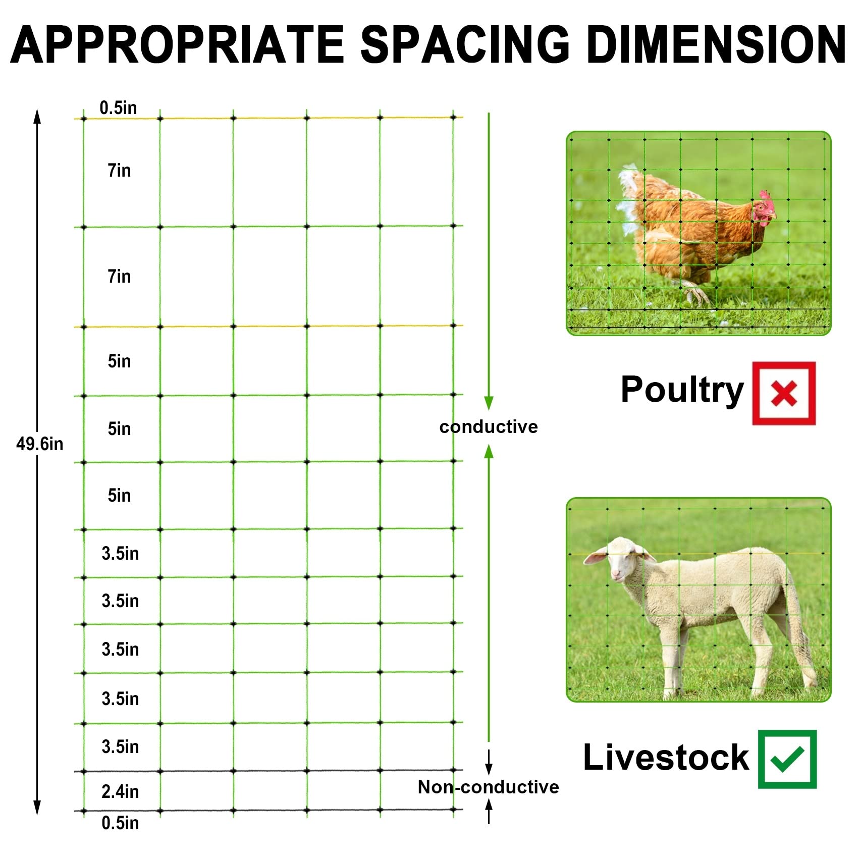 π Safe Electric Fence Netting: Our electric goat fence consists 9 horizontal strands( 7 conductive), in which the lowest 2 horizontal strands are insulated to avoid fence grounding to conduct electricity. The mesh is smaller in the lower area which effectively keeps livestock, protects beehives, or deters predators from a garden.