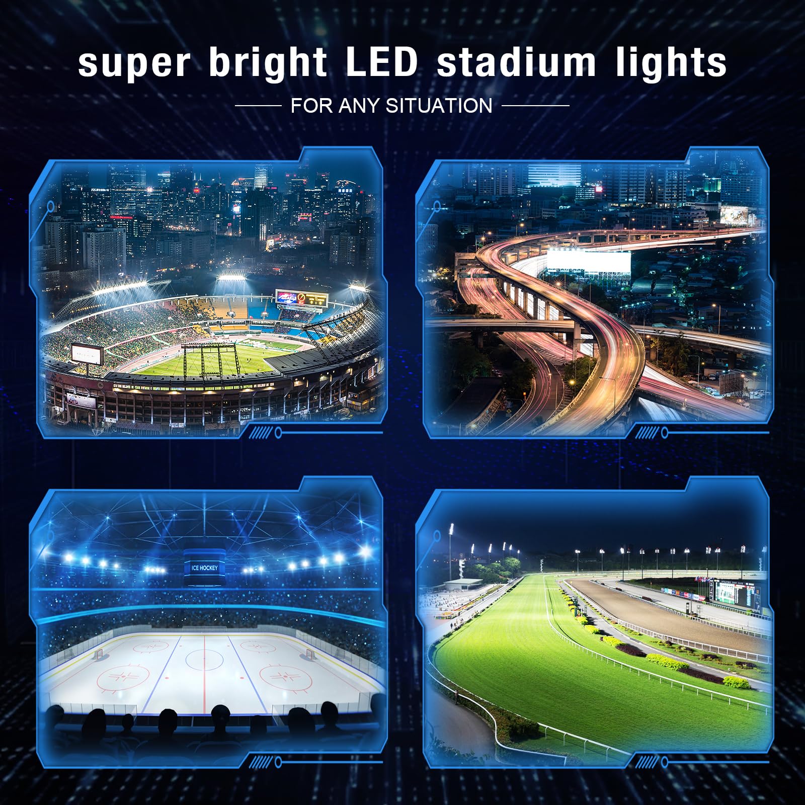 HDTV Sports Broadcast-Grade Lighting: Flicker-free LED lighting meets high-definition photography and ultra-slow-motion replay standards (RA > 80), suitable for large football stadiums, golf courses, ski resorts, horse racing tracks, professional basketball courts, elevated roads, parking lots, airports, railways, and other commercial and industrial lighting scenarios