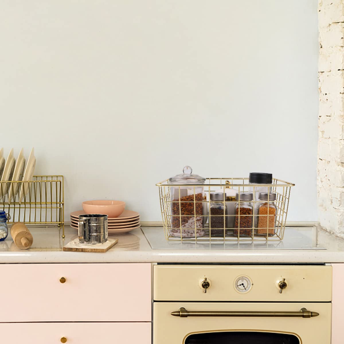 Tonxus 4pcs Wire Kitchen Storage Basket Farmhouse Metal Household Container Storage Organizer Bin Divider with Handle for Pantry,Shelf,Countertop,Refrigerator,Freezer,Cabinet (Gold)
