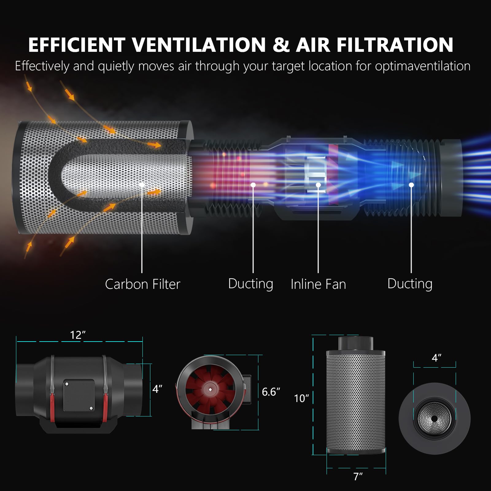 4" Ventilation Kit: 1.5” Layer Coal Based activated carbon used with steel mylar with mesh,fan is working on 120V 60HZ with 190CFM high air flow, also 4"φ 25FT ducting included with 3 Galvanized steel Clamps.This ventilation system used will eliminate most undesirable odors, pungent smell and particulates from indoor grow tent, hydroponics grow room(Effective Odor Control)