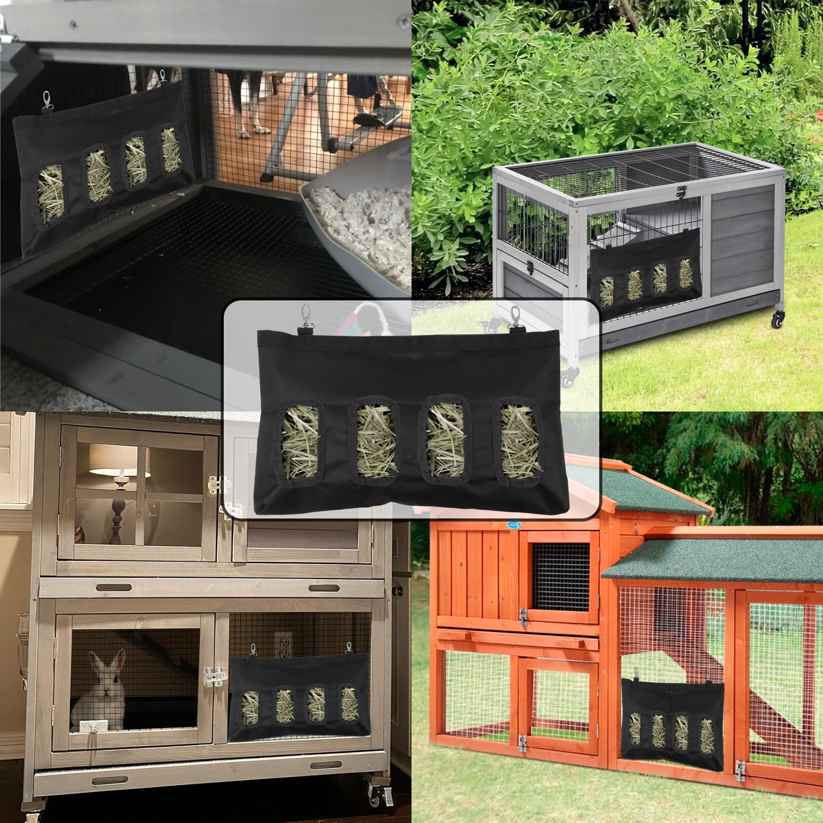 Quality: The rabbit hay feeder bag is made of 600D Oxford cloth, soft and foldable,easy to clean,save time and ensure hygiene.Waterproof inner coating and the hooks are of good quality.