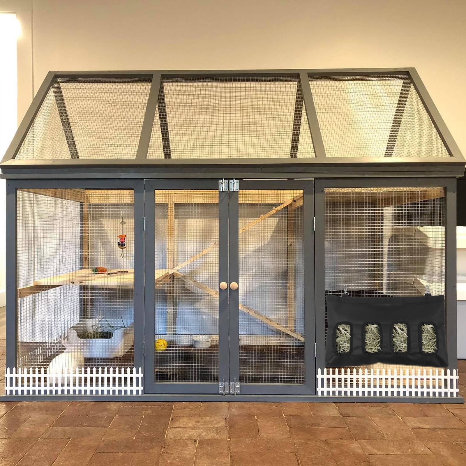 Use: The rabbit hay feeder bag of this rabbit can be hung on any cage, as long as the buckle is used to buckle on the cage, the hay bag can be fixed on the cage.