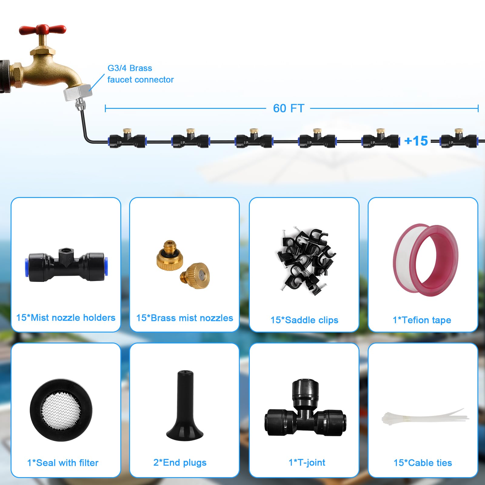 DIY Own Misting System: Compared to pre-installed mister systems, ours is purely DIY, which lets you enjoy the fun of DIY, and allows you to cut and install it as your desires! 60 Feet long PE cables, 15 brass nozzles and T-connectors, also comes with cable ties and saddle clips, Teflon tape and other accessories to meet your needs!