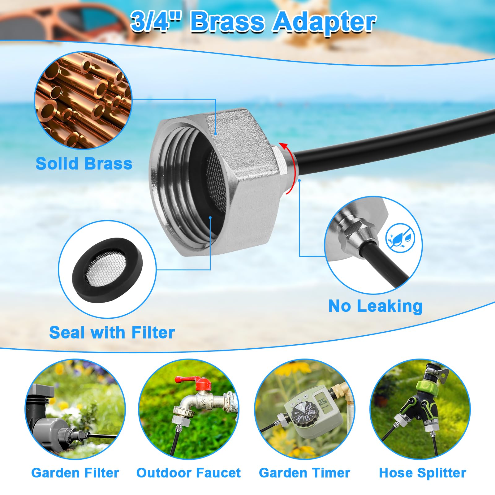 Upgraded Premium Quality: The misting cooling system comes with a brass adapter (3/4") with filter and upgraded brass nozzles which are no leaking and have more smooth spray. Flexible durable PE misting tupe is resistant to wear and tear, and built to withstand outdoor elements.