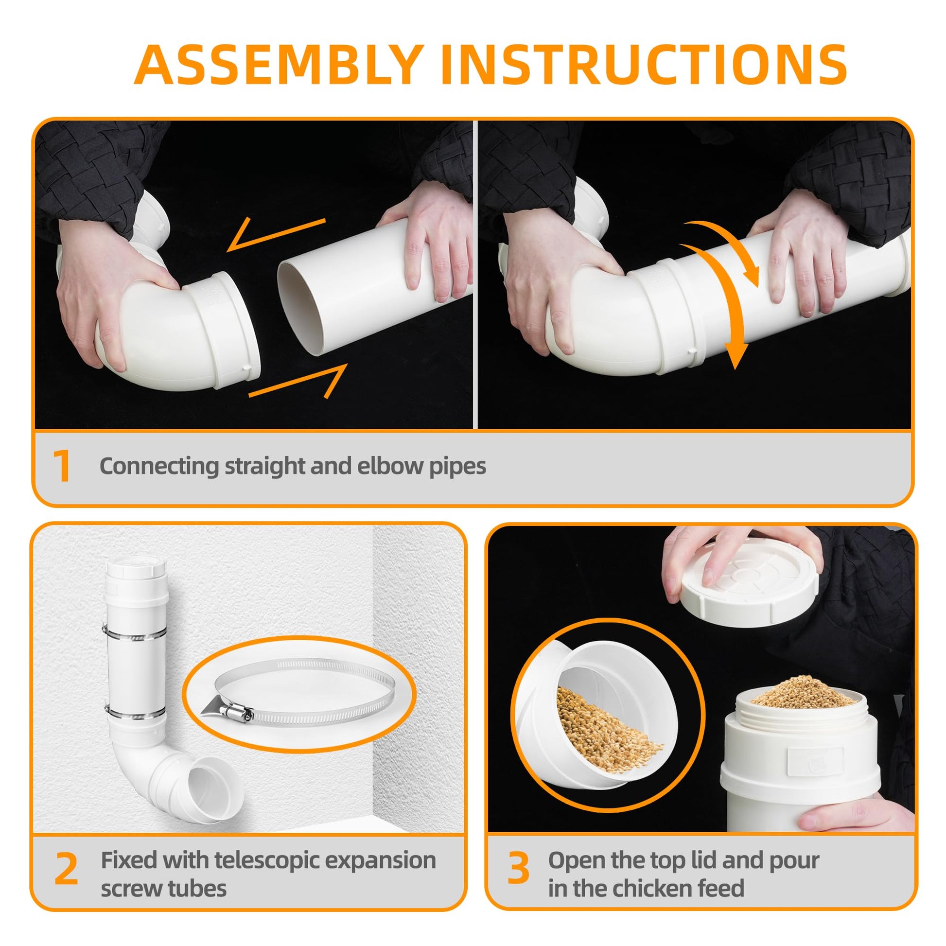 Install and fill easily: Our feeder kit can only be used inside the coop, you just simply install it, open the top and put in the chicken food. NOTE: Please choose a wall away from rain and water to avoid feed wastage due to water ingress into the feeder.