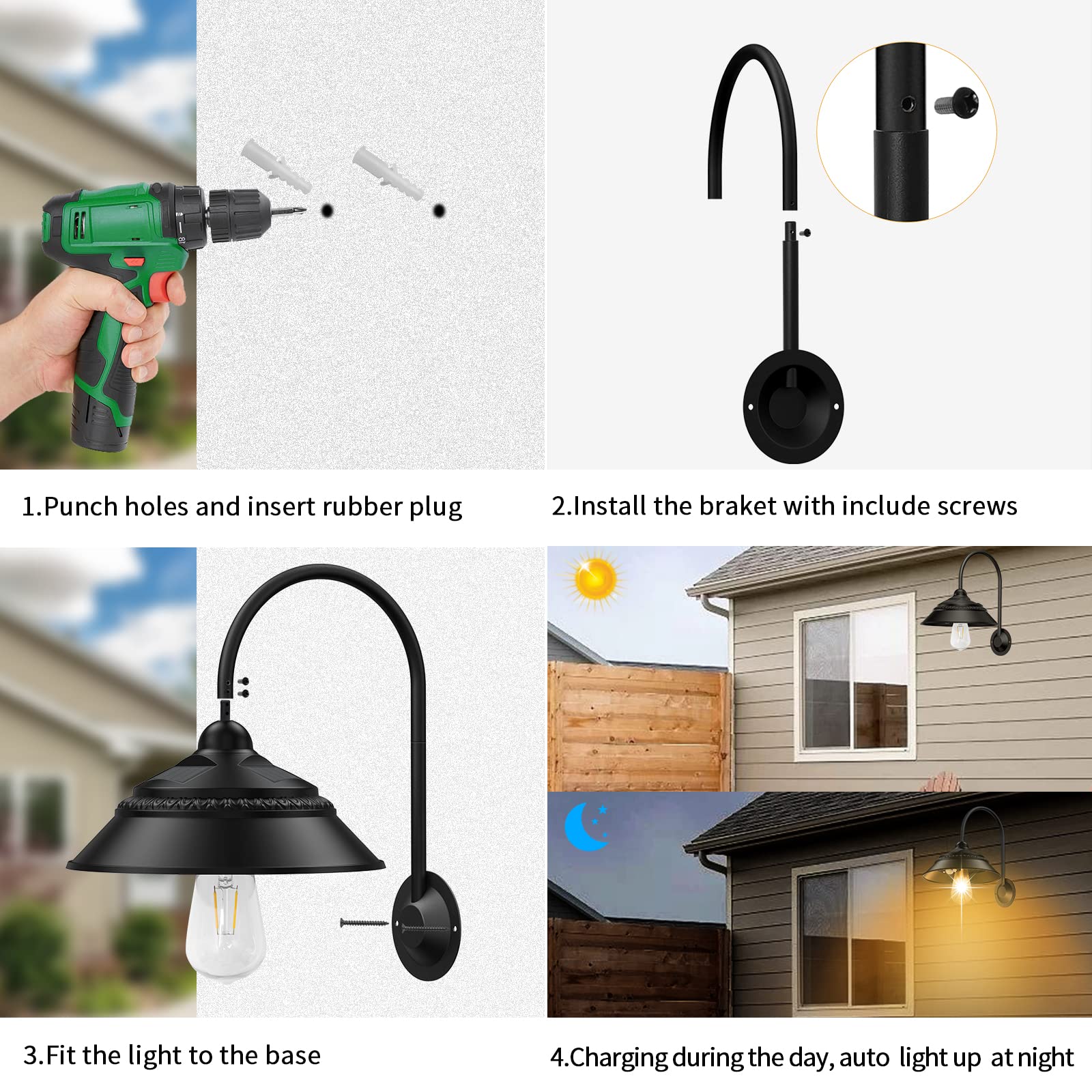 【Solar Barn Lights Outdoor】This outdoor wall lights are a combination of retro style and solar energy concept design. The elegant gooseneck and curved top allow the top solar panel to fully absorb solar energy. This solar barn lights adds a motion sensor and mode switching function that other similar lights do not have. The monocrystalline laminated solar panel has higher conversion, longer endurance and brighter lighting, create more convenience for your life.