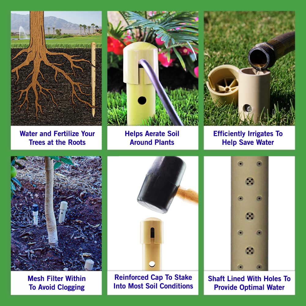 ROOT WATERING TOOL – The Deep Drip Spikes encourage deeper tree root growth by delivering water, oxygen, nutrients, and fertilizer directly into the soil. Save water and reduce surface evaporation.