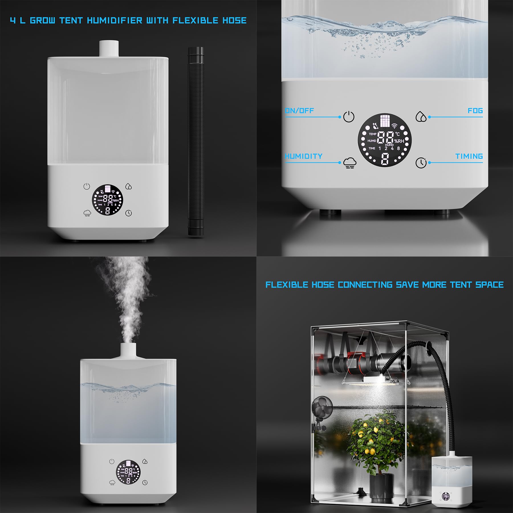 GROW TENT HUMIDIFIER : Continue Working And Making A Better Humidity Environment As The Plants Growing Need . 4 Level Fog Adjustable, Auto Time Control Setting , Digital LCD Temperature And Humidity Display, Extra Plastic Tube Make This Set Can Working While Outside The Tent Save More Tent Space 4L Big Water Capicity!