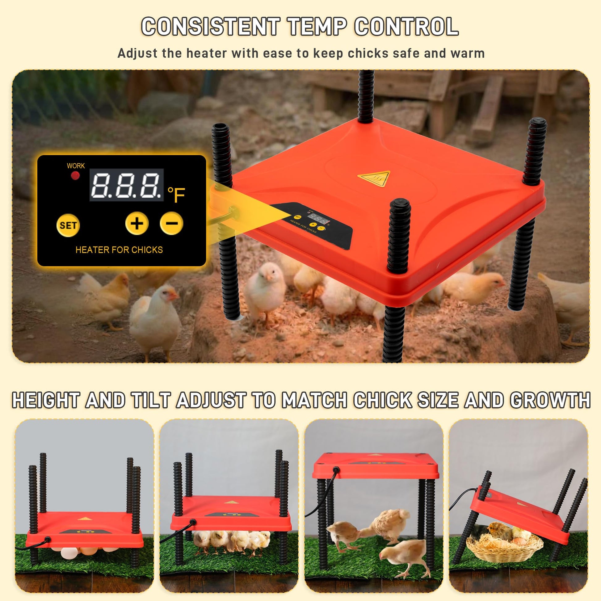 【Adjustable & Smart Heater Plate】 Keep chicks warm with a temperature-controlled chick brooder heating plate offering precise manual adjustment from 50°F to 158°F, plus a real-time digital display (32°F–210°F) for quick monitoring. Even heat mimics a mother hen to promote healthy growth while saving energy. Tool-free height and tilt adjustments and a compact 11.8" x 11.8" design easily adapt as chicks grow. Safe, space-saving, and simple to clean.
