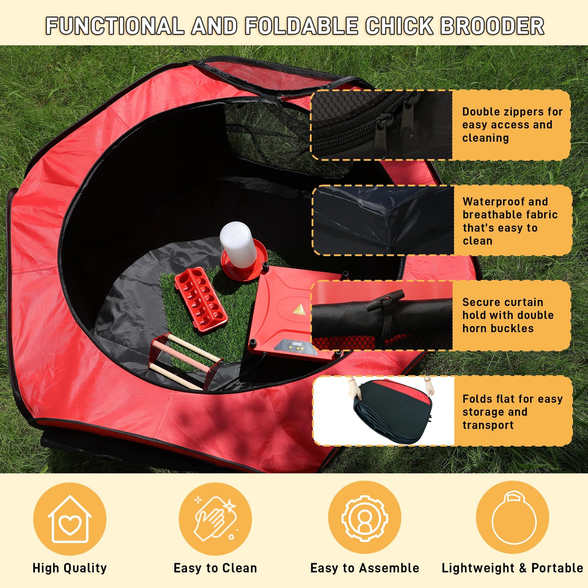 【Easy to Clean & Maintain】 Made with high-quality, washable Oxford fabric, this chick brooder tent is designed for hassle-free cleaning and quick drying. The removable mat inside can be easily taken out and rinsed, drying within hours for fast turnaround. The detachable top mesh and double zipper door allow thorough cleaning. The chicken feeder and waterer kit, made from BPA-free plastic, are also easy to wash, ensuring a safe and hygienic environment for your chicks with minimal effort.