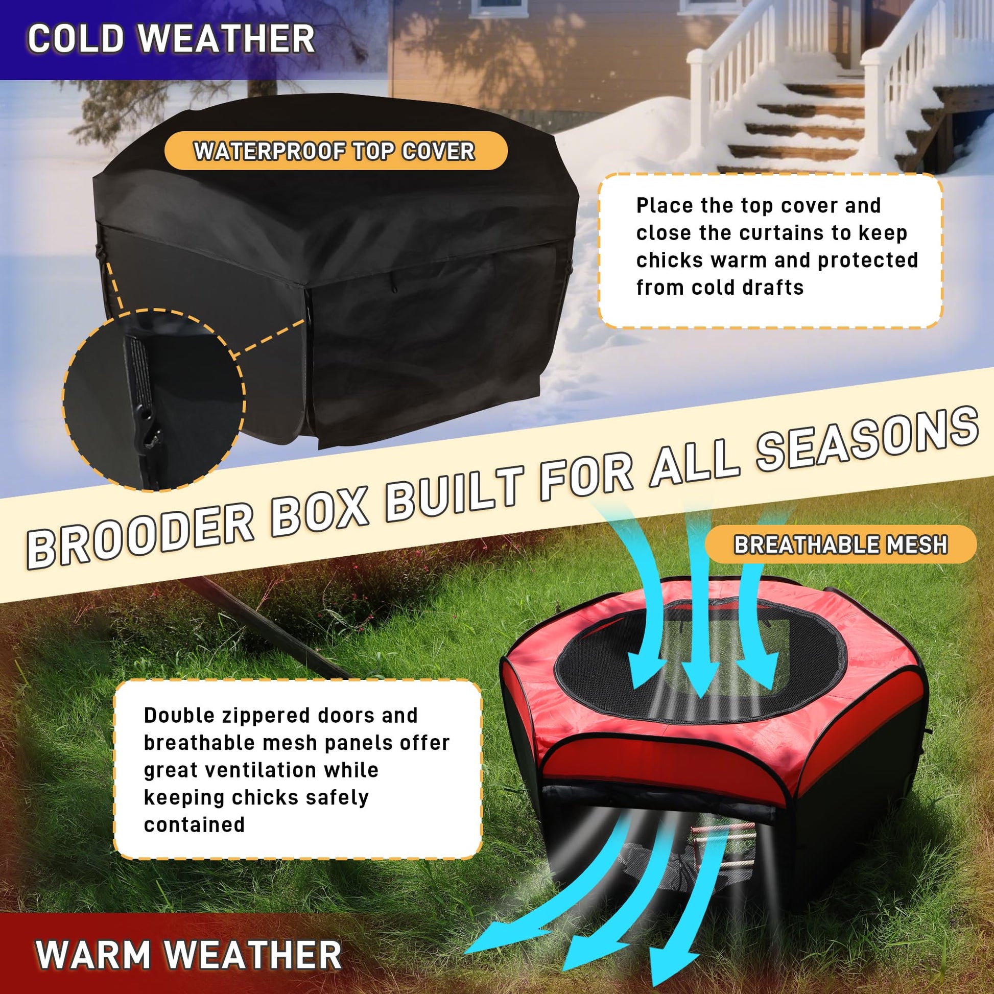 【All-Season Pop-Up Chicken Playpen】This portable chick playpen doubles as a chick brooder box, featuring dual-layer doors, a removable top cover, and three-sided breathable mesh for year-round comfort indoors or outdoors. In summer, open the mesh panels for excellent airflow and a cooler environment. In winter, close the curtains and top cover to block wind and retain warmth. The mesh sides let you observe chicks easily while preventing escapes, while the spacious design gives them room to move, rest, and play safely.